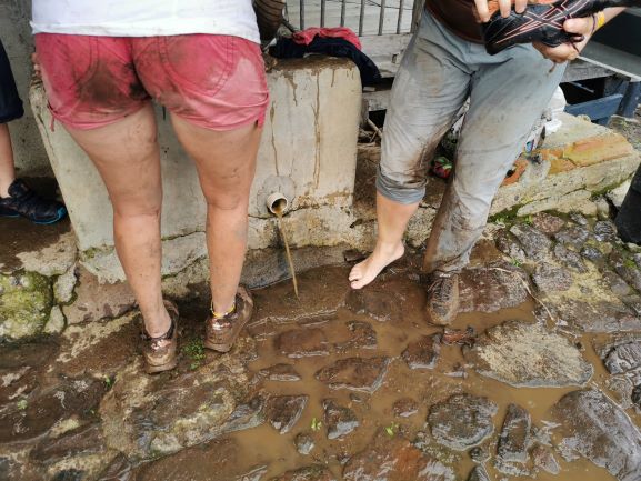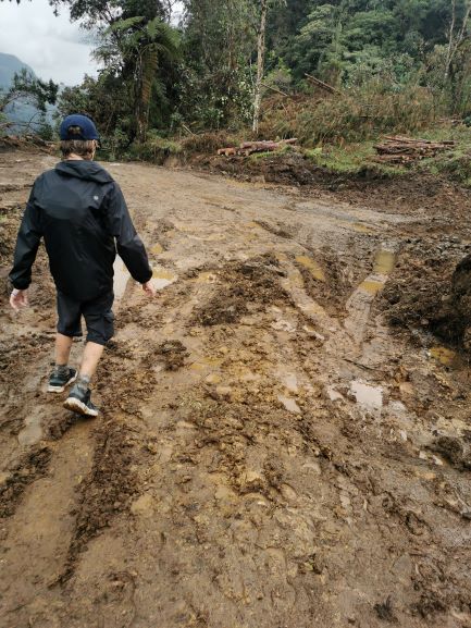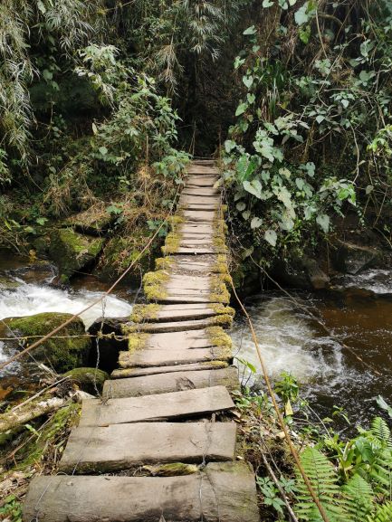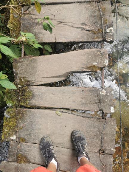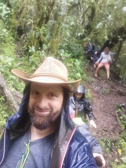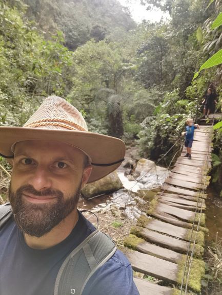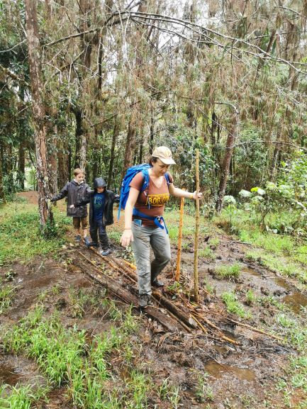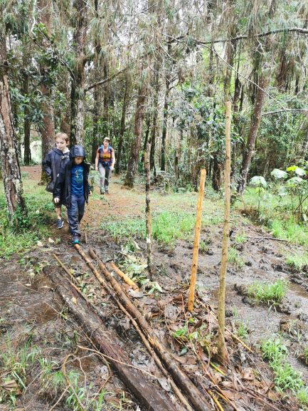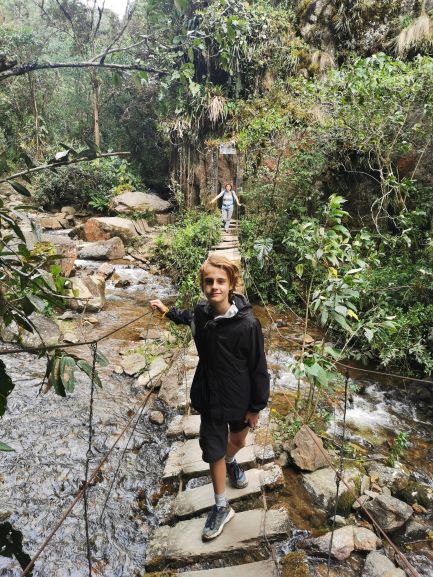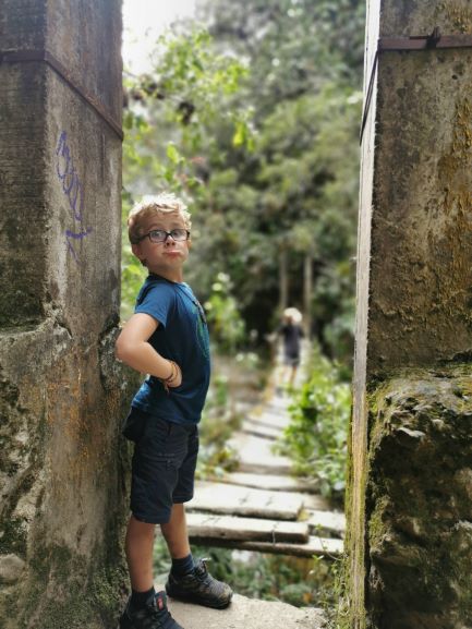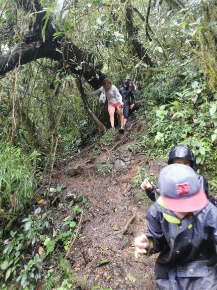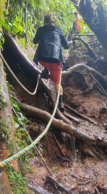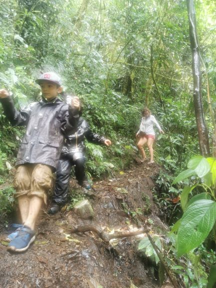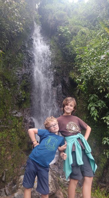Après quelques recherches, on finit par retrouver le chemin qui grimpe dans la montagne et évite le glissement de terrain. La pluie commence à tomber de plus en plus. Au bout d’une dizaine de minutes, nous sommes détrempés de la tête au pied. Le chemin est difficile, très boueux avec quelques passages où on s’enfonce jusqu’aux chevilles. On croise quelques groupes qui ne nous rassurent pas sur le temps de marche qu’il nous reste à parcourir. Certains membres de la troupe commencent à se démotiver… Mais pas les deux petits Malo et Hugo son copain qui carburent devant. A la fin de la montée, nous arrivons sur un chemin qui descend à la verticale avec une corde. C’est vraiment l’aventure ! Ludo gère les 2 petits et chacun se débrouille comme il peut pour descendre sans glisser mais clairement on ne se voit pas faire le retour. On arrive au torrent où nous faisons une pause pique-nique très rapide car tout est trempé et on est gelés. On commence chacun silencieusement à chercher au fond de nous-même un reste d’énergie et de gnac pour finir cette randonnée… Nous devons traverser le torrent à l’aide d’un pont de singe avant de rejoindre la dernière cascade pour laquelle nous étions venus. Au vue de nos difficultés sur l’aller, nous préférons ne pas faire le même chemin et finir la boucle en espérant arriver un jour… Le ciel redevient menaçant, le tonnerre commence à gronder, ce qui ne nous rassure pas au vue des expériences que nous avons eu quelque fois avec la foudre. Cela nous met le bon petit coup de pression pour marcher plus vite et en finir avec cette randonnée. Il nous faudra encore quelques heures pour rejoindre la civilisation. Nous finissons par tomber sur une ferme isolée. C’est notre chance, car nous ne captons pas le réseau. Les fermiers nous proposent de nous nettoyer dans leur fontaine pendant qu’ils appellent un taxi pour nous ramener au village. Il est 17h, nous avons marché 13km dans la boue et fait 1000m de dénivelé ! On est « au bout de notre vie », trempés, frigorifiés, on rêve de la douche bien chaude. En tout cas, ça restera un sacré souvenir avec la famille Et pourquoi pas aller voir ailleurs ?