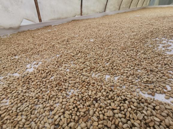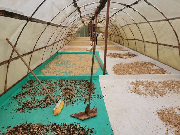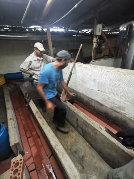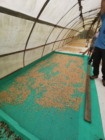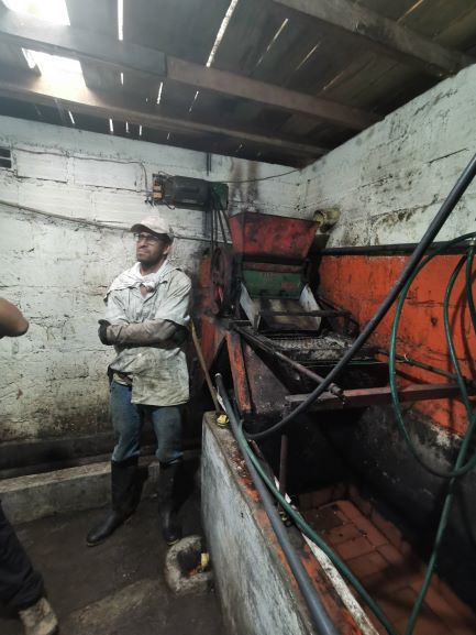 Puis nous allons du côté de la production du produit fini : les « fruits » du caféier ramassés sont passer dans une machine qui enlève la 1ère pellicule. Ils sont lavés et fermentent ensuite dans une cuve. Ils sont de nouveau relavés pour enlever la 2ème pellicule un peu gluante. Ensuite ils arrivent dans une sorte de goulotte dans laquelle on va trier les 3 qualités de café : les plus légers en premier sont les moins qualitatifs car il reste encore des pellicules et souvent ils sont plutôt creux, la moyenne qualité et enfin la très bonne qualité. Ces grains sont ensuite séchés dans une serre, toujours répartis par niveau de qualité. Et c’est assez flagrant quand on pèse les grains : les moins bons qui servent à faire de l’instantané sont beaucoup plus légers par rapport aux très bons grains qui partiront principalement pour la consommation des étrangers. Et oui, ce qui est dingue en Colombie, c’est que le café est bien moins bon dans leur pays que celui que l’on boit en France ! Il l’appelle d’ailleurs le tinto, et pour faire passer le goût ils mettent une tonne de sucre…