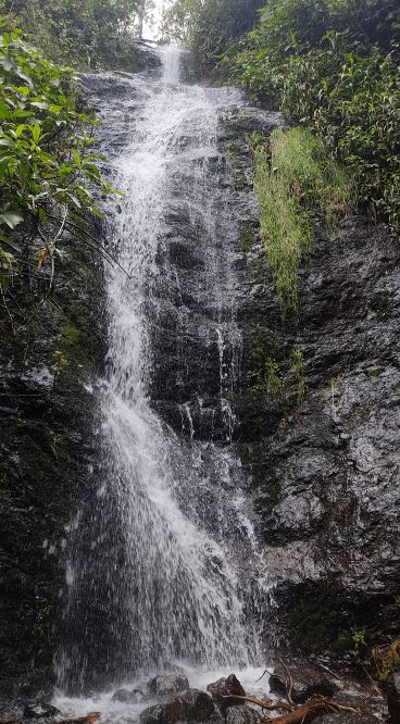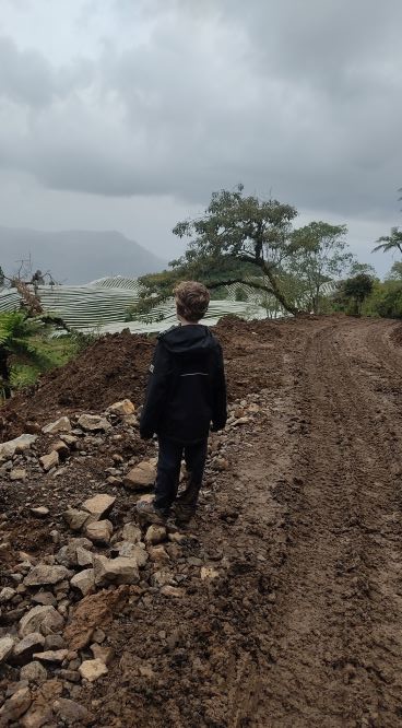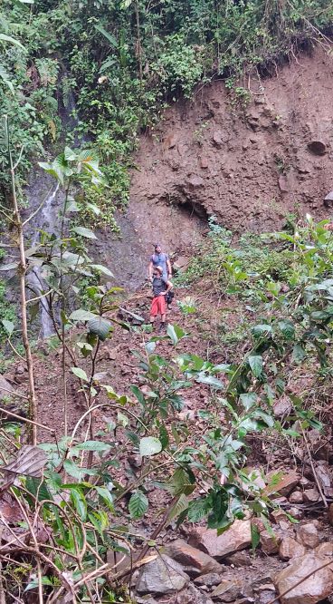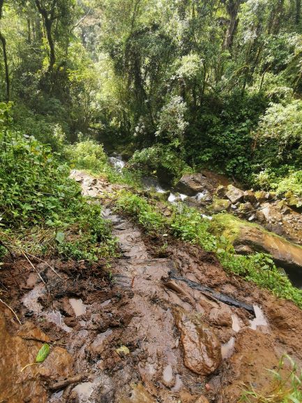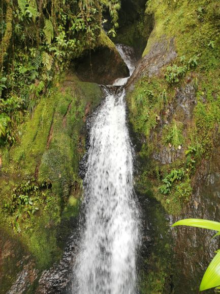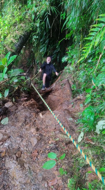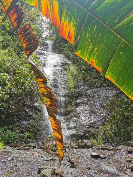 On est partis. Ca commence par monter tranquille, quelques ruisseaux à traverser, on est prudents pour ne pas se mouiller. Petit à petit on traverse les champs de bananiers, les prés des vaches, attention aux bouses bien fraiches… Ca commence à devenir de plus en plus boueux… Les petits, Malo et son copain Hugo, filent devant avec Ludo. Notre grand préfère fermer la marche derrière notre ami, Stéphane, qui a décidé de nous accompagner malgré son entorse à la cheville. Ca commence à se compliquer pour ne pas se mouiller les pieds voire même s’embourber, au bout d’une heure de marche, on a compris qu’il fallait renoncer à vouloir éviter de mouiller ou salir les chaussures, allez on y va en plein dedans… Nous arrivons à un cul de sac après la 1ère cascade, il semble y avoir eu un glissement de terrain on ne voit plus de chemin.