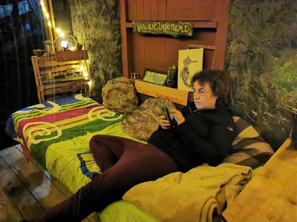 Nous rentrons tranquillement à notre hotel avec de quoi préparer notre dîner vegan. Nous rencontrons deux couples de français avec lesquels nous échangeons avec plaisir sur nos projets respectifs durant la soirée. Et puis tout le monde va au lit tôt pour se préparer à la grosse journée de ballade du lendemain.