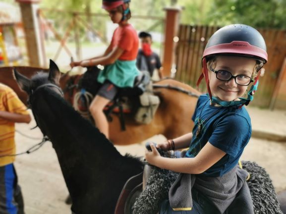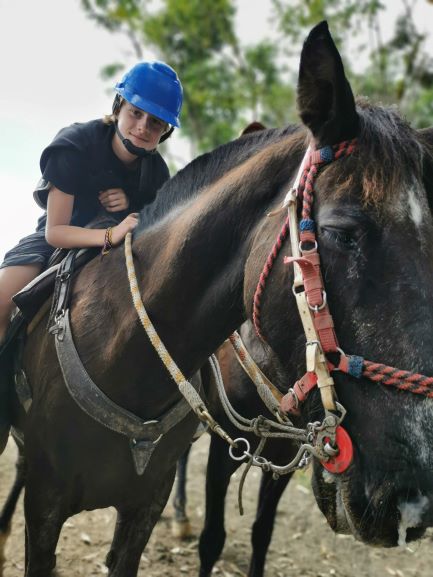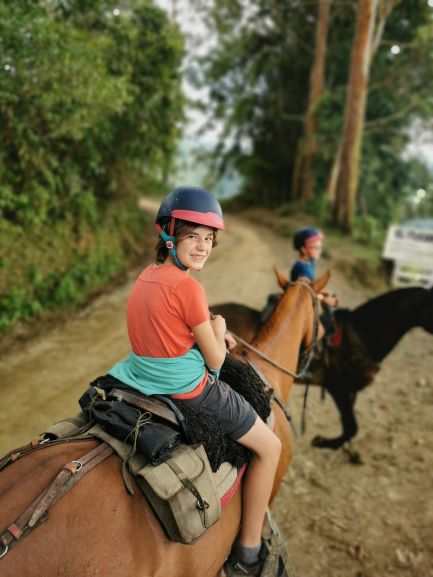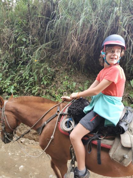 L’après-midi, nous nous décidons pour un petit tour à cheval d’une heure. Les enfants sont ravis et trouvent très rapidement leurs aises sur leur destrier. Hugo va même à pousser plusieurs fois le trot. Malheureusement pour moi, mon cheval suit ses camarades et je ne suis pas du tout à l’aise sur un cheval… La ballade est belle car nous prenons une fois de plus de la hauteur et profitons de jolis points de vue sur la vallée. Personnellement je suis contente de rentrer tellement je suis tendue. Quand on descend de nos montures, nous avons l’impression d’être des cow-boys et avons du mal à retrouver une façon de marcher normale ! Les enfants nous demandent déjà quand ils pourront refaire du cheval…