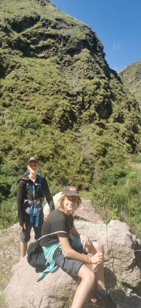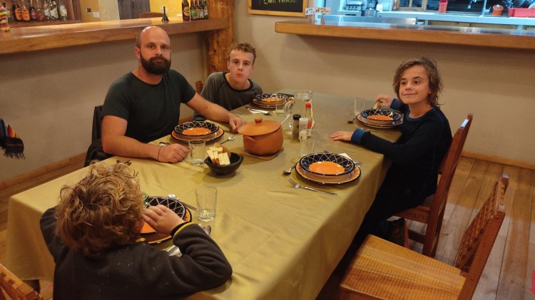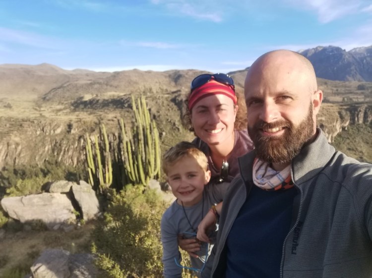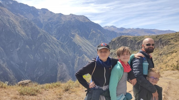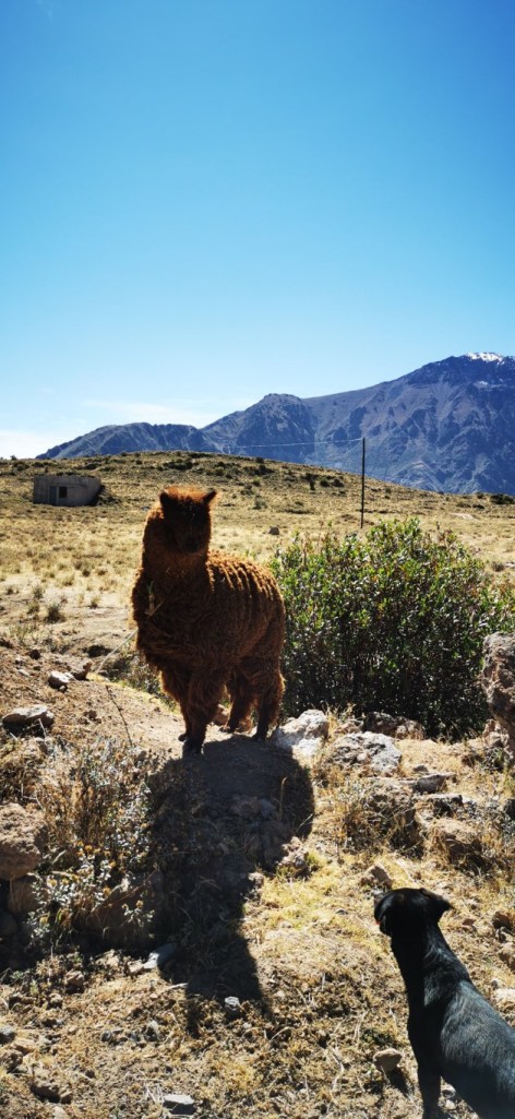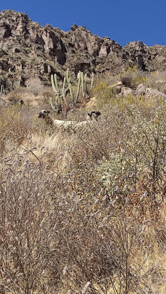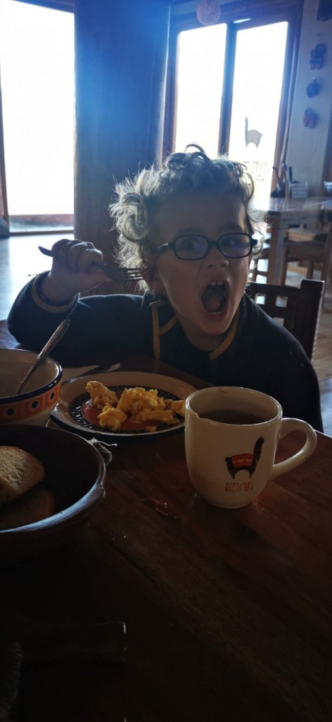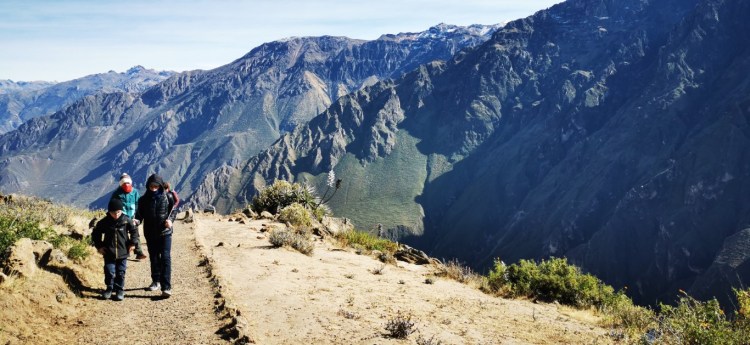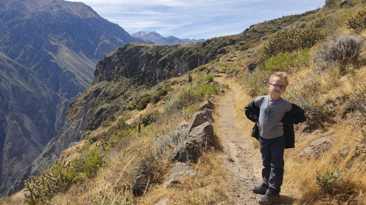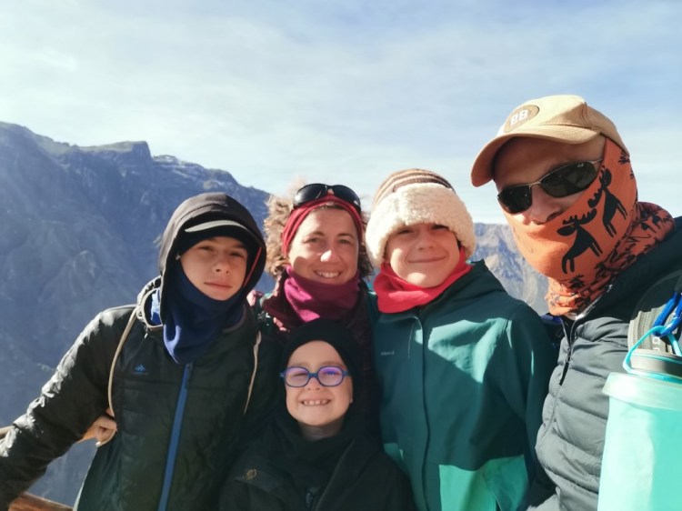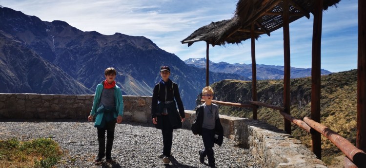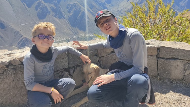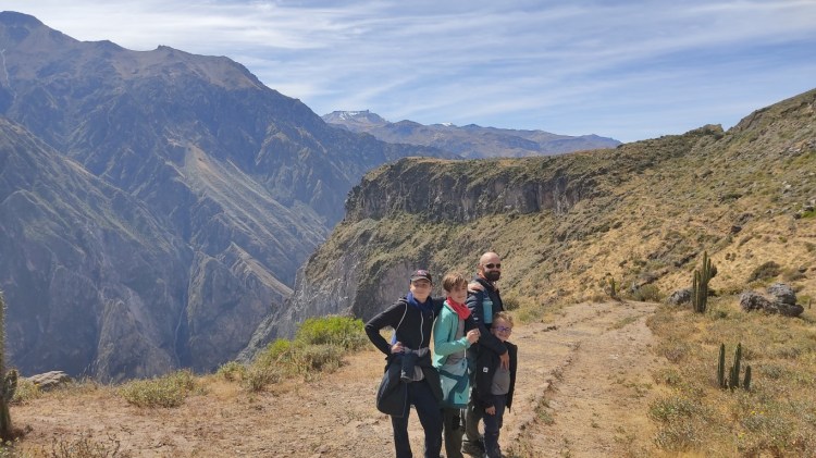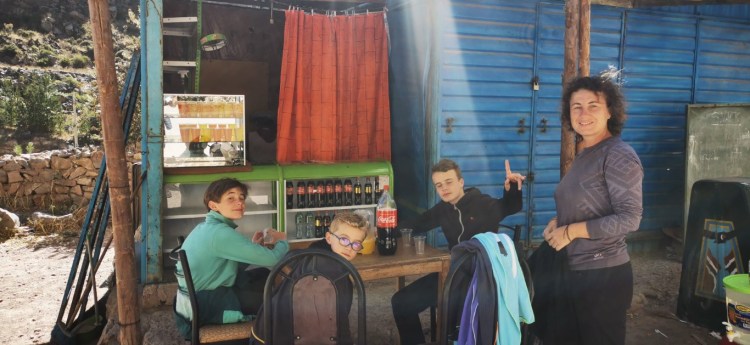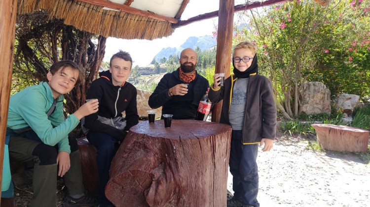 Le lendemain matin, nous décidons de faire le tour des miradors du village sur le canyon. Les deux chiens du propriétaire ont décidé de nous suivre dans notre ballade, pour le plus grand bonheur des enfants. Nous rejoignons donc deux premiers miradors en bordure du village, nous prenons quelques photos puis décidons de continuer sur le chemin du trek qui descend tout au fond du canyon. Pour le coup, c’est une autre partie de plaisir… Ludo avec son vertige préfère avancer vite jusqu’au prochain mirador et nous laisse Louis et moi à la traine. Hugo et Malo suivent leur père facilement avec les 2 chiens vu qu’ils n’ont pas de vertige. J’emmène pas large et je constate que Louis prend énormément sur lui pour avancer à bonne allure sur le chemin. Avant le tour du monde, il serait resté prostré quelque part pour ne plus avancer, qu’est-ce qu’il a progressé sur ce point, je suis fière de lui. Les chiens ne nous facilitent pas la tâche. Un troupeau de moutons paissaient tranquillement sur les flans très raides de la montagne. Ils ont décidé de les pourchasser. Du coup, on se retrouve à croiser sur ce chemin escarpé des moutons apeurés et des chiens excités… Bref ils nous font de bonne frayeur. Nous nous arrêtons à un dernier point de vue donnant un autre angle sur le canyon : nous faisons quelques photos, Ludo fait voler son drone puis nous rebroussons chemin rapidement pour retrouver des terres plus sûre. Nous rentrons toujours avec les chiens (bien qu’on a vraiment failli les perdre dans la montagne avec ces moutons) à l’auberge pour le déjeuner.