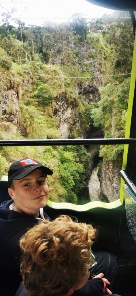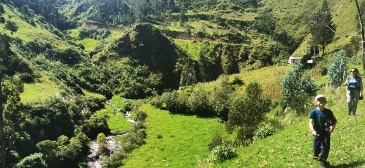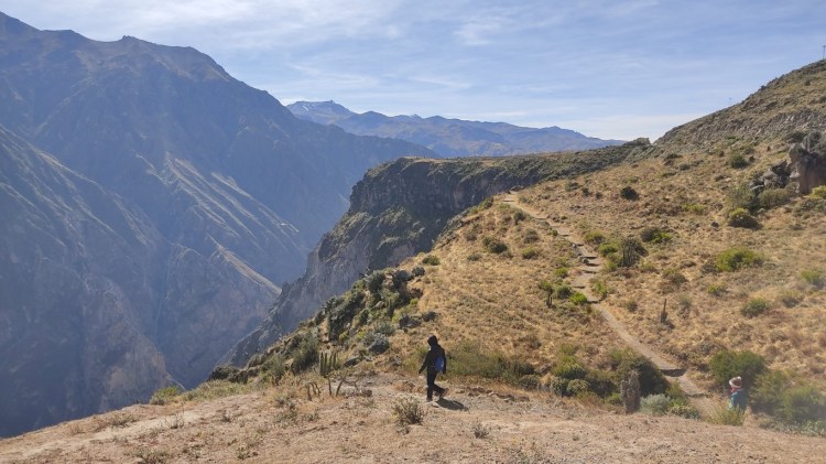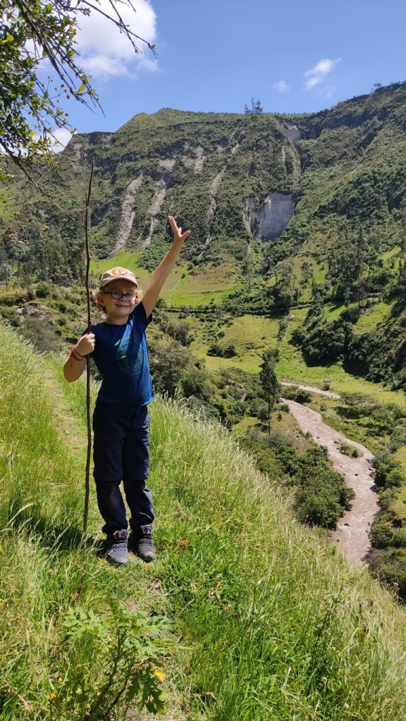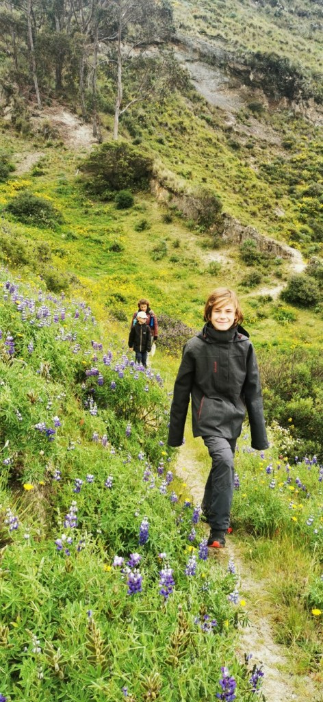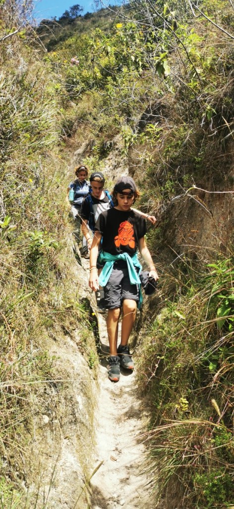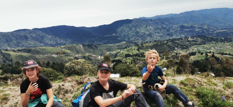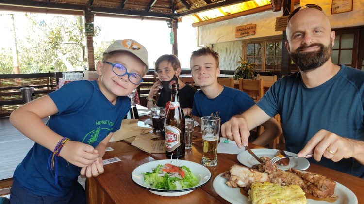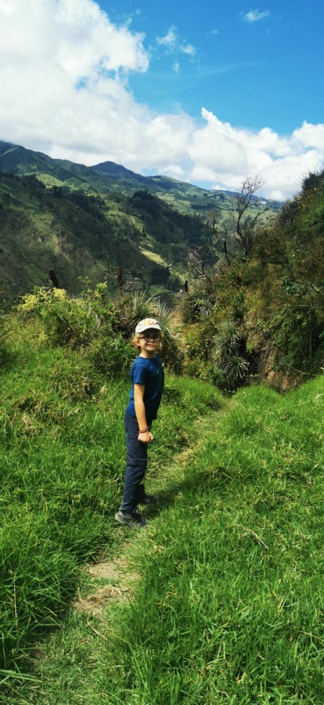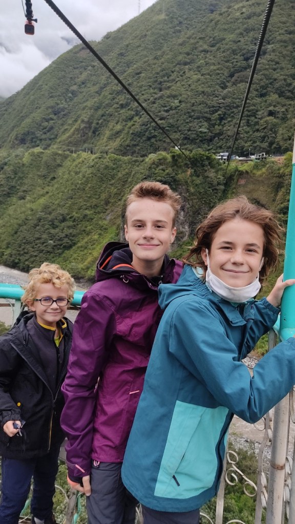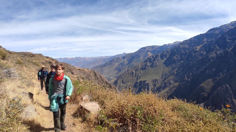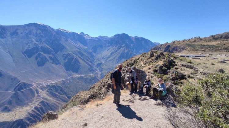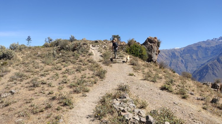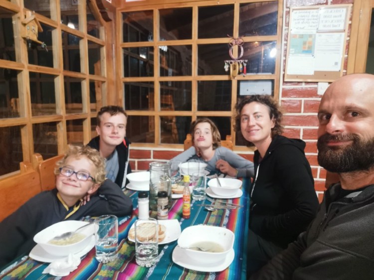 Le lendemain matin, nous décidons de faire le tour des miradors du village sur le canyon. Les deux chiens du propriétaire ont décidé de nous suivre dans notre ballade, pour le plus grand bonheur des enfants. Nous rejoignons donc deux premiers miradors en bordure du village, nous prenons quelques photos puis décidons de continuer sur le chemin du trek qui descend tout au fond du canyon. Pour le coup, c’est une autre partie de plaisir… Ludo avec son vertige préfère avancer vite jusqu’au prochain mirador et nous laisse Louis et moi à la traine. Hugo et Malo suivent leur père facilement avec les 2 chiens vu qu’ils n’ont pas de vertige. J’emmène pas large et je constate que Louis prend énormément sur lui pour avancer à bonne allure sur le chemin. Avant le tour du monde, il serait resté prostré quelque part pour ne plus avancer, qu’est-ce qu’il a progressé sur ce point, je suis fière de lui. Les chiens ne nous facilitent pas la tâche. Un troupeau de moutons paissaient tranquillement sur les flans très raides de la montagne. Ils ont décidé de les pourchasser. Du coup, on se retrouve à croiser sur ce chemin escarpé des moutons apeurés et des chiens excités… Bref ils nous font de bonne frayeur. Nous nous arrêtons à un dernier point de vue donnant un autre angle sur le canyon : nous faisons quelques photos, Ludo fait voler son drone puis nous rebroussons chemin rapidement pour retrouver des terres plus sûre. Nous rentrons toujours avec les chiens (bien qu’on a vraiment failli les perdre dans la montagne avec ces moutons) à l’auberge pour le déjeuner.