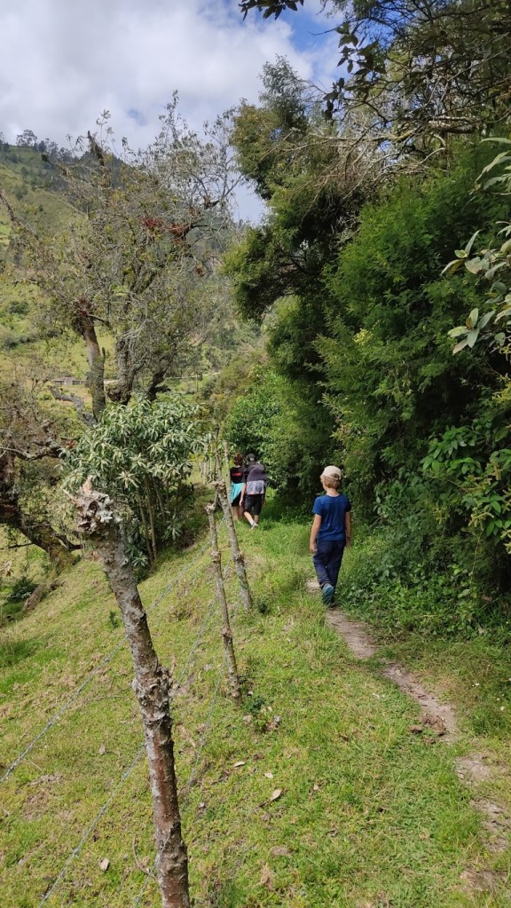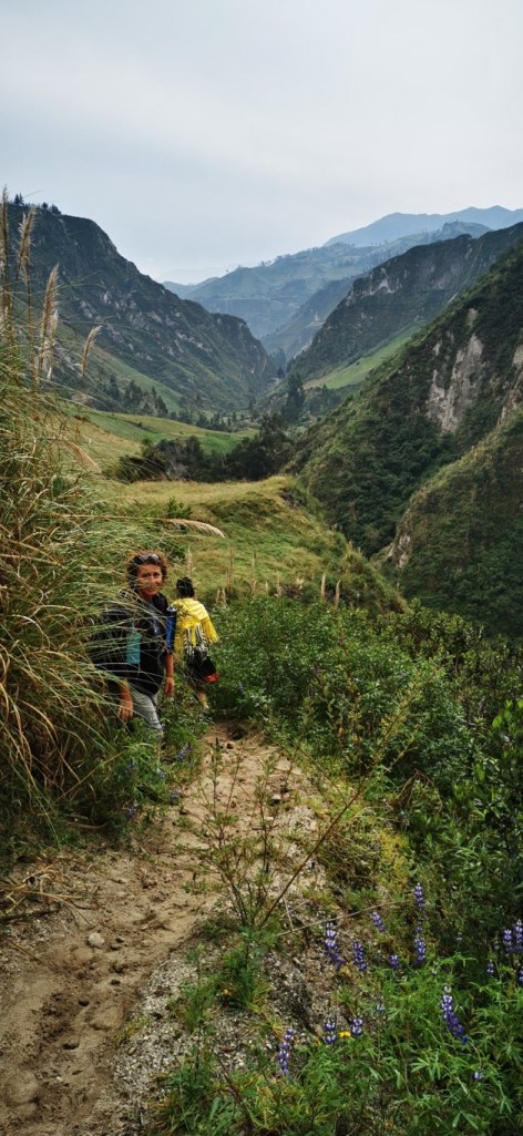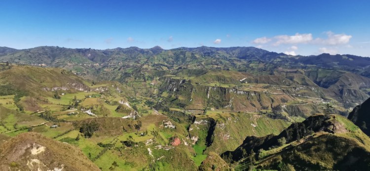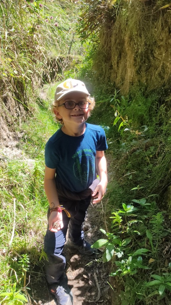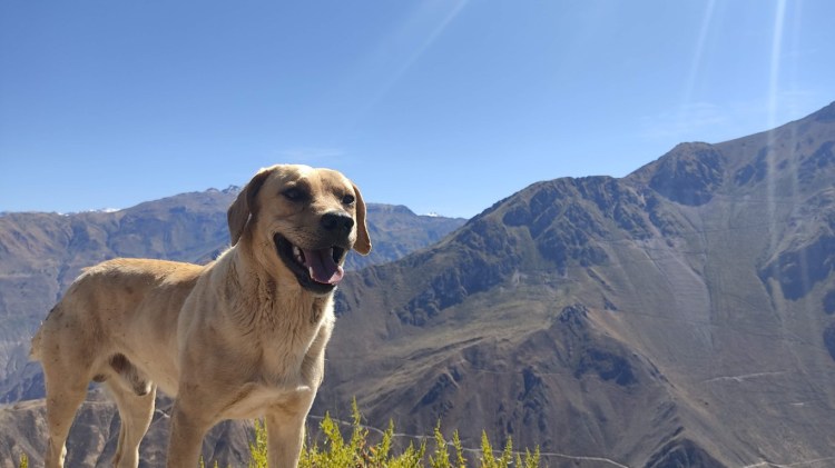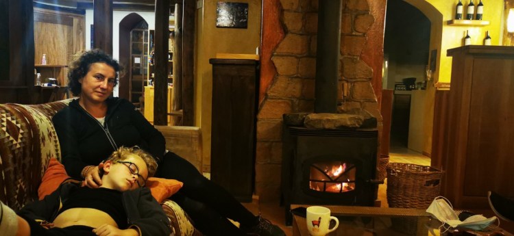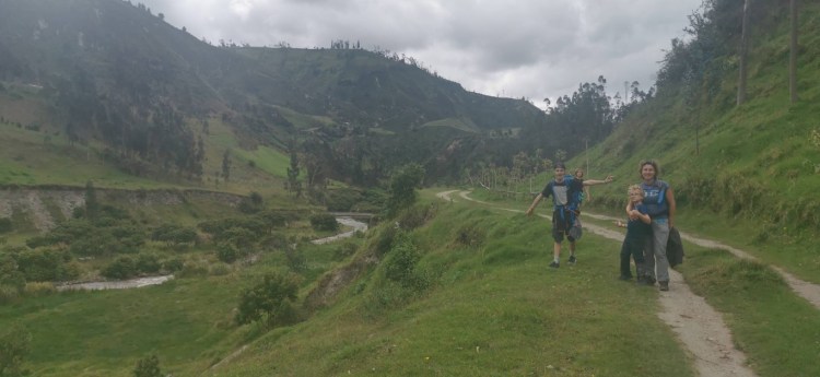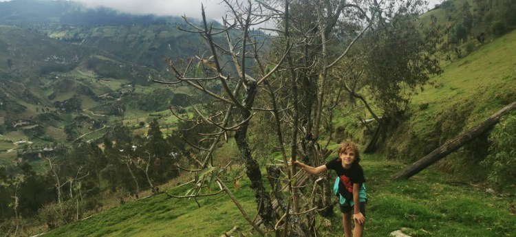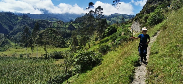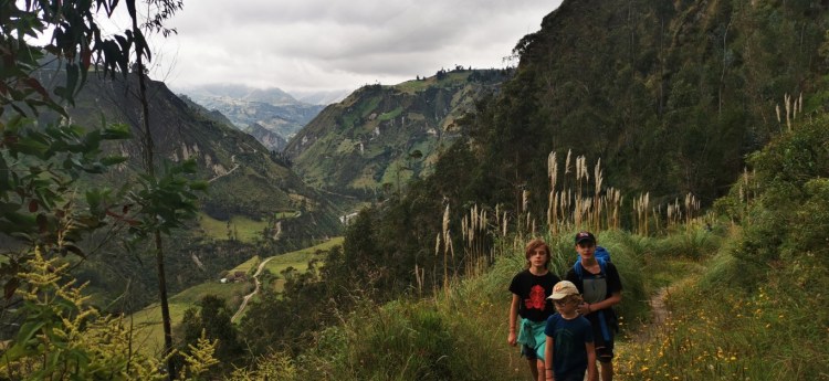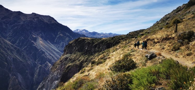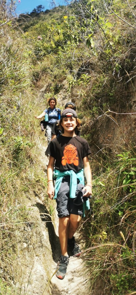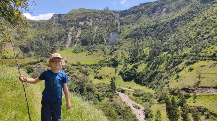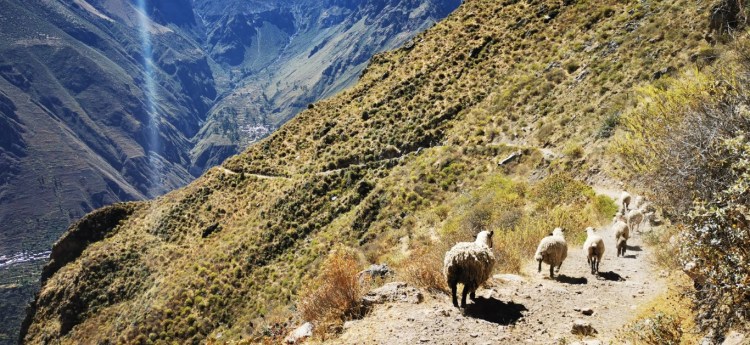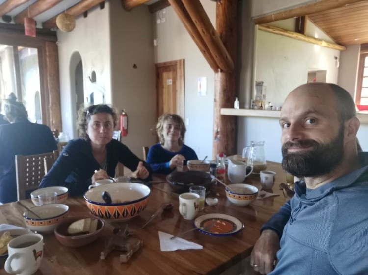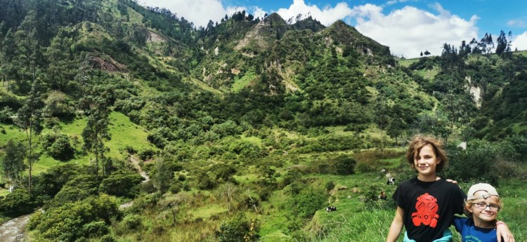 Le lendemain matin, nous décidons de faire le tour des miradors du village sur le canyon. Les deux chiens du propriétaire ont décidé de nous suivre dans notre ballade, pour le plus grand bonheur des enfants. Nous rejoignons donc deux premiers miradors en bordure du village, nous prenons quelques photos puis décidons de continuer sur le chemin du trek qui descend tout au fond du canyon. Pour le coup, c’est une autre partie de plaisir… Ludo avec son vertige préfère avancer vite jusqu’au prochain mirador et nous laisse Louis et moi à la traine. Hugo et Malo suivent leur père facilement avec les 2 chiens vu qu’ils n’ont pas de vertige. J’emmène pas large et je constate que Louis prend énormément sur lui pour avancer à bonne allure sur le chemin. Avant le tour du monde, il serait resté prostré quelque part pour ne plus avancer, qu’est-ce qu’il a progressé sur ce point, je suis fière de lui. Les chiens ne nous facilitent pas la tâche. Un troupeau de moutons paissaient tranquillement sur les flans très raides de la montagne. Ils ont décidé de les pourchasser. Du coup, on se retrouve à croiser sur ce chemin escarpé des moutons apeurés et des chiens excités… Bref ils nous font de bonne frayeur. Nous nous arrêtons à un dernier point de vue donnant un autre angle sur le canyon : nous faisons quelques photos, Ludo fait voler son drone puis nous rebroussons chemin rapidement pour retrouver des terres plus sûre. Nous rentrons toujours avec les chiens (bien qu’on a vraiment failli les perdre dans la montagne avec ces moutons) à l’auberge pour le déjeuner.