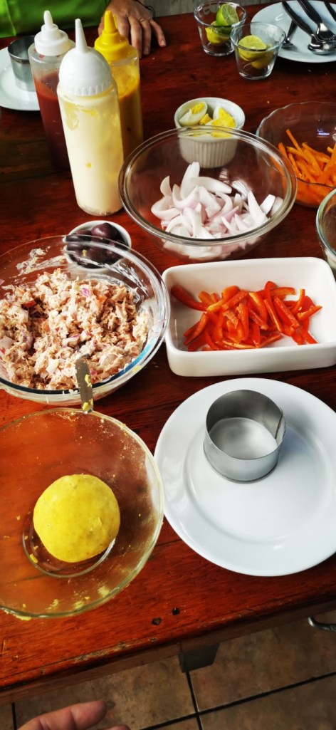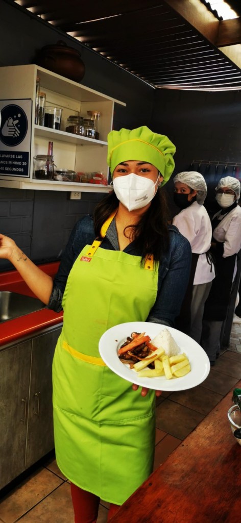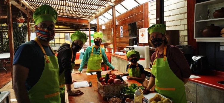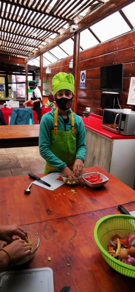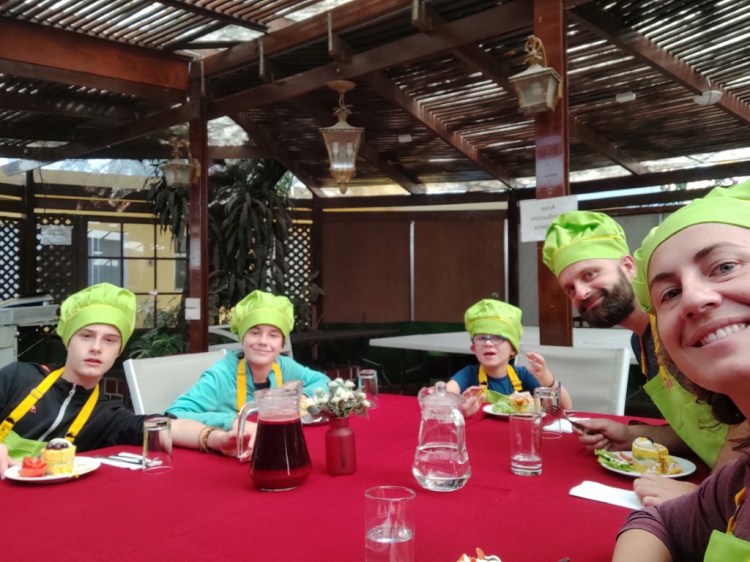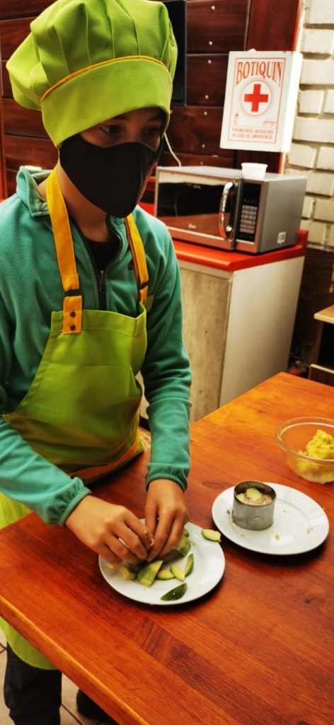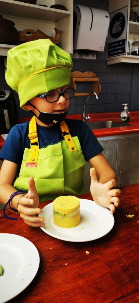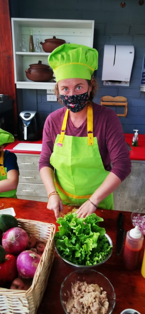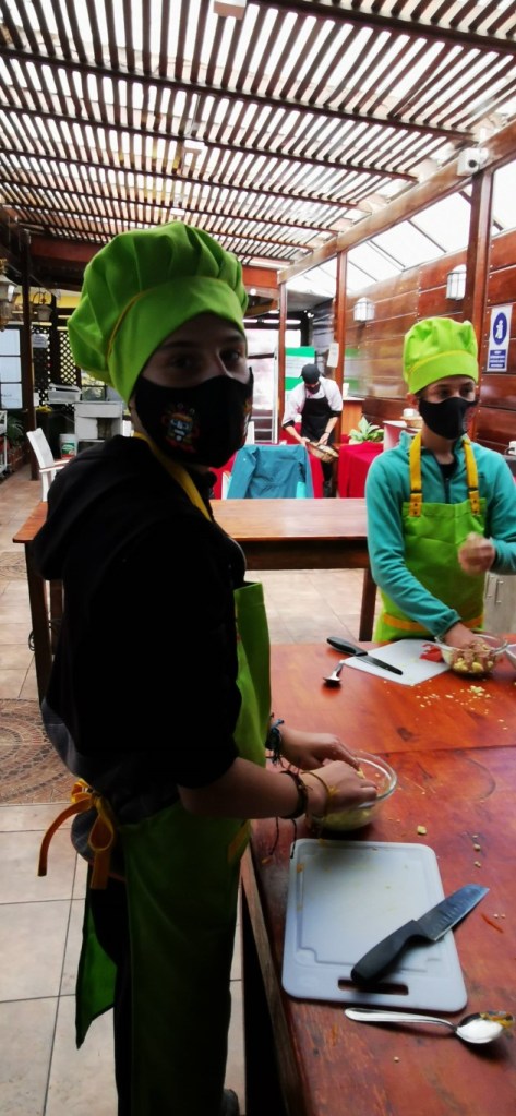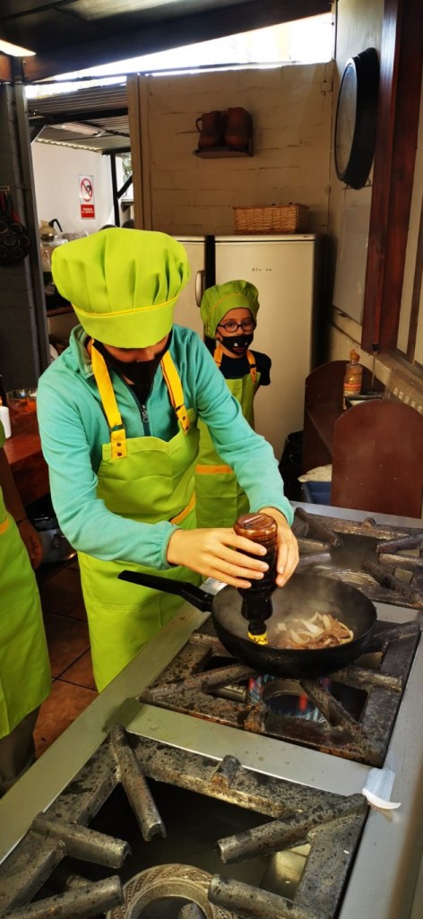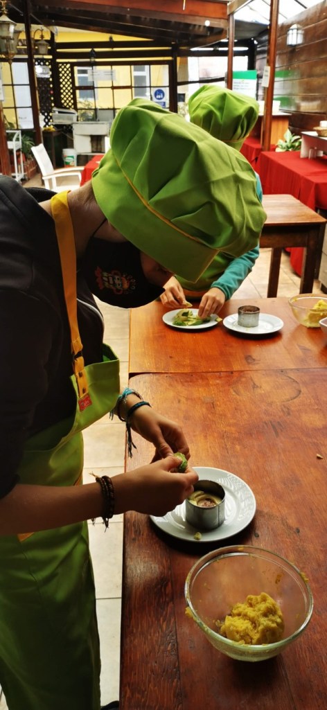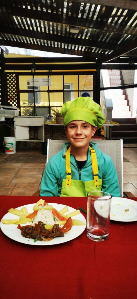 Nous sommes reçus dans une belle auberge au style colonial avec une grande cour intérieur. La chef Alejandra nous reçoit et nous donne notre équipement : tablier et chapeau de cuisinier vert anis, on dirait ratatouille:) et c’est parti pour 2 heures de cuisine. Nous préparons en entrée la Causa Rellena : il s’agit d’une entrée à base de purée de pommes de terre, thon, tomate, oignons, citrons, aji jaune et avocat. Ensuite libre à chacun de bien présenter son assiette, les enfants ont été de vrais artistes ! Pour le plat principal, nous cuisinons un lomo saltado : il s’agit d’un bœuf que l’on fait flamber à l’asiatique avec du aji jaune, de l’oignon, de la sauce soja, de la sauce d’huîtres et du vin rouge. Le tout est servi avec des frites maison et du riz bien sûr. On se régale. Et pour clôturer le tout, en dessert, elle nous sert une crema volteada, à base de quinoa sous la forme d’un riz au lait avec de la cannelle.