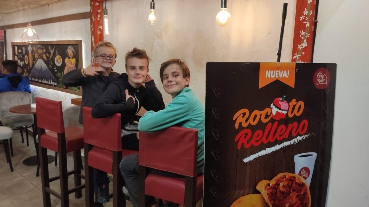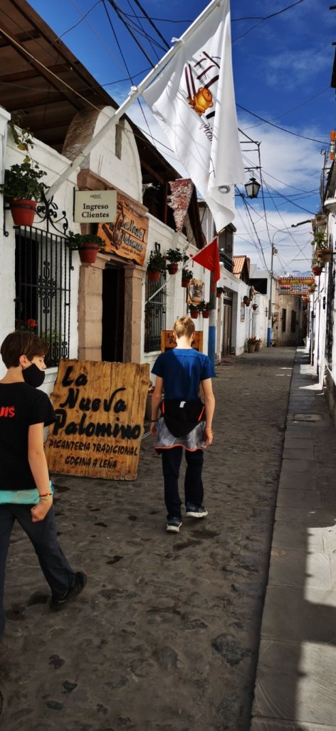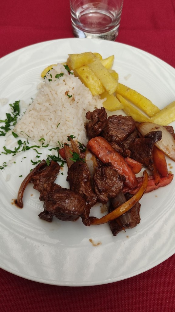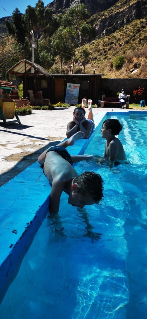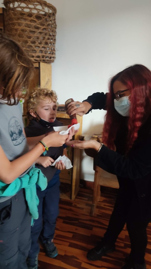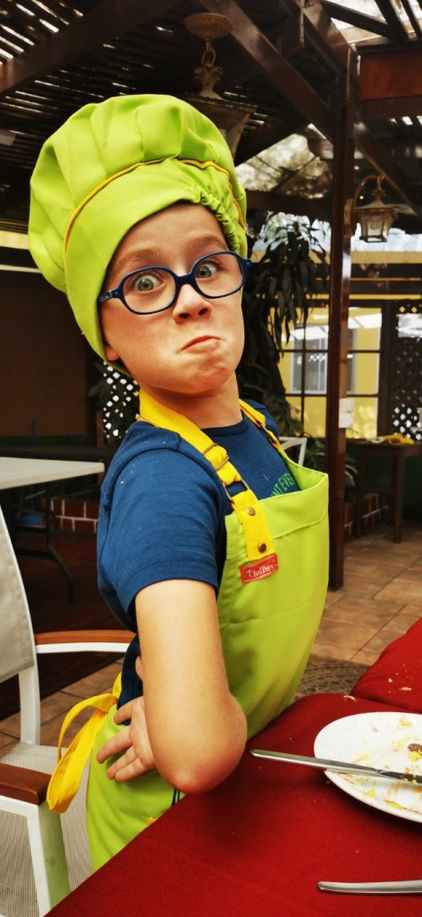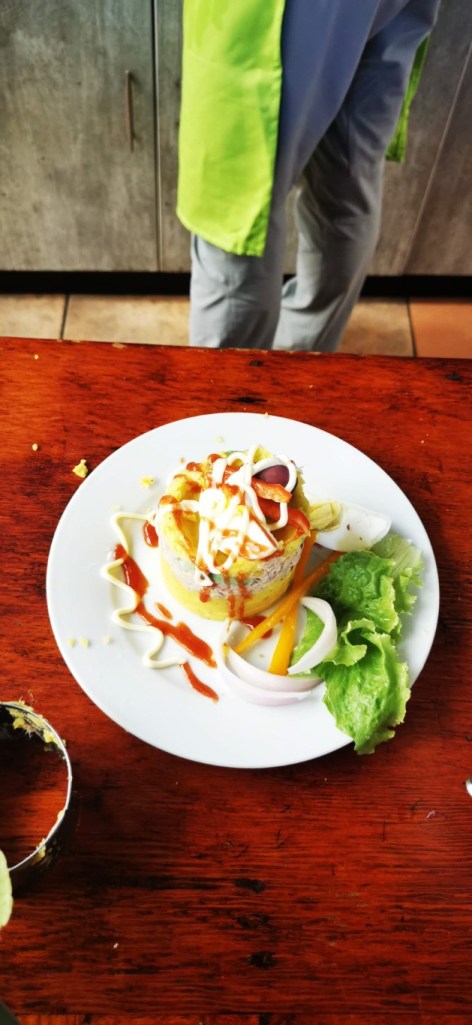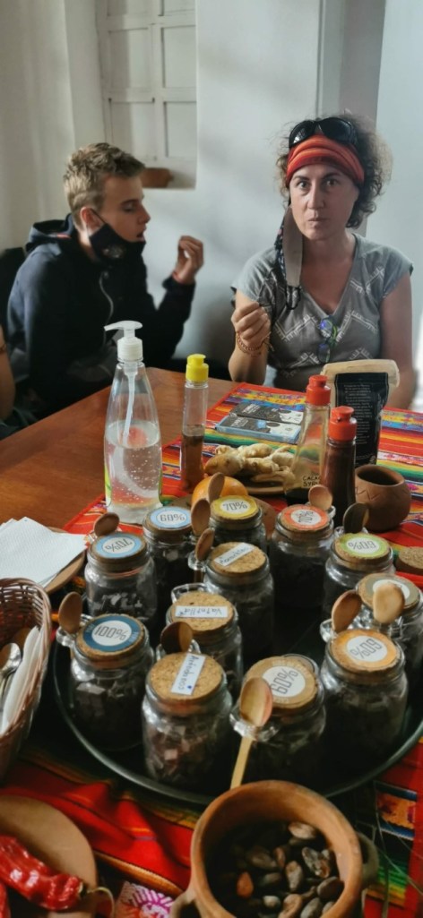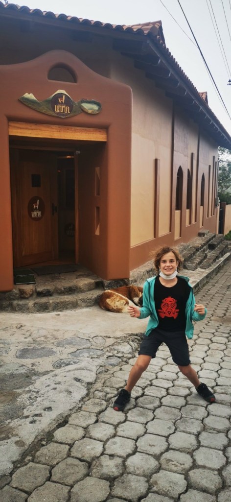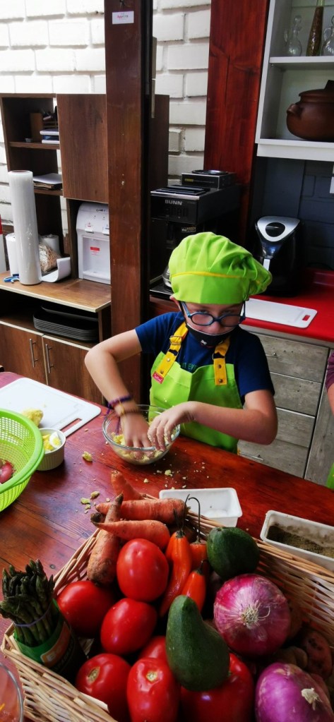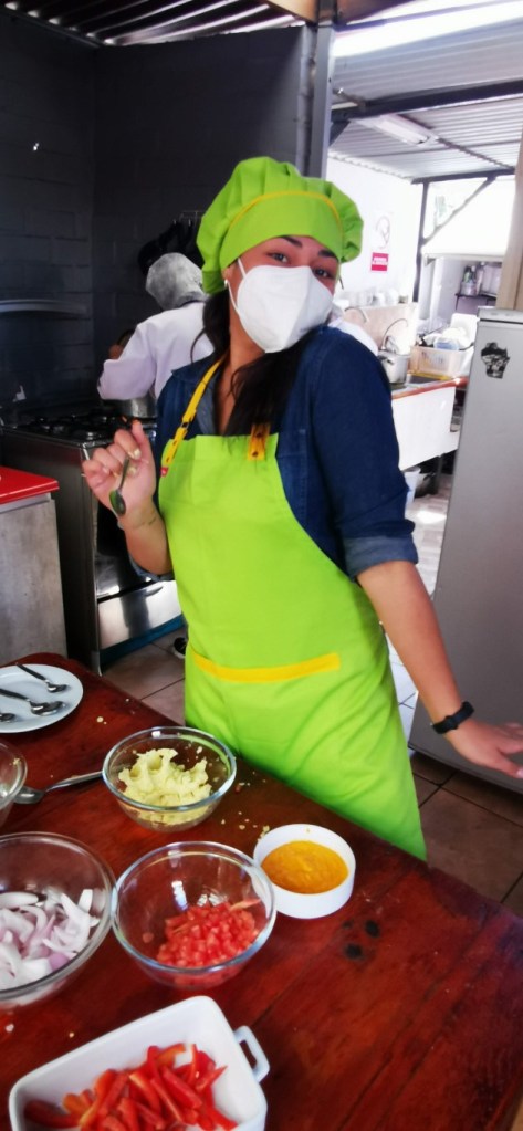 Nous sommes reçus dans une belle auberge au style colonial avec une grande cour intérieur. La chef Alejandra nous reçoit et nous donne notre équipement : tablier et chapeau de cuisinier vert anis, on dirait ratatouille:) et c’est parti pour 2 heures de cuisine. Nous préparons en entrée la Causa Rellena : il s’agit d’une entrée à base de purée de pommes de terre, thon, tomate, oignons, citrons, aji jaune et avocat. Ensuite libre à chacun de bien présenter son assiette, les enfants ont été de vrais artistes ! Pour le plat principal, nous cuisinons un lomo saltado : il s’agit d’un bœuf que l’on fait flamber à l’asiatique avec du aji jaune, de l’oignon, de la sauce soja, de la sauce d’huîtres et du vin rouge. Le tout est servi avec des frites maison et du riz bien sûr. On se régale. Et pour clôturer le tout, en dessert, elle nous sert une crema volteada, à base de quinoa sous la forme d’un riz au lait avec de la cannelle.