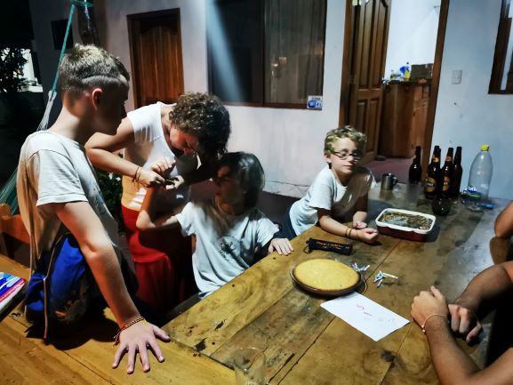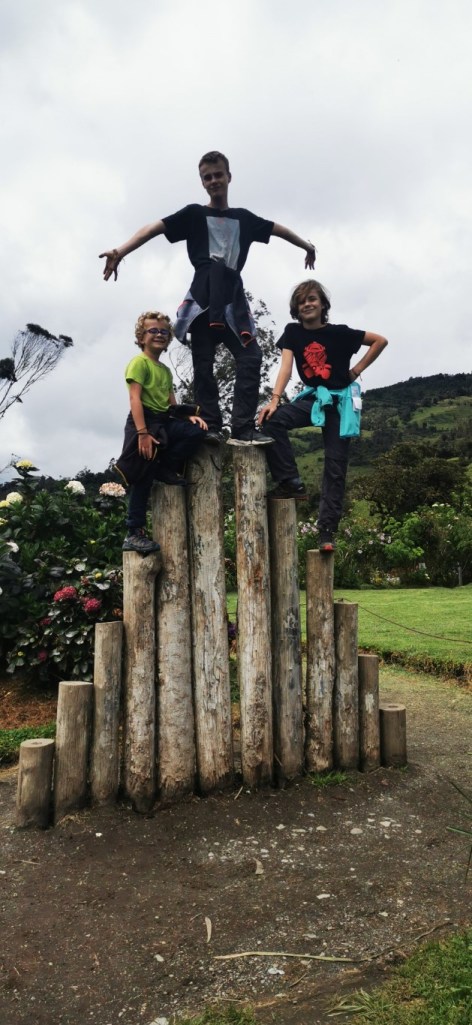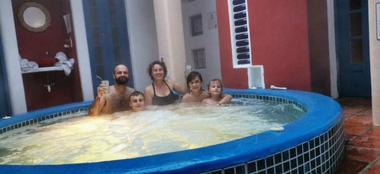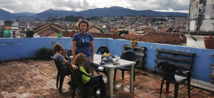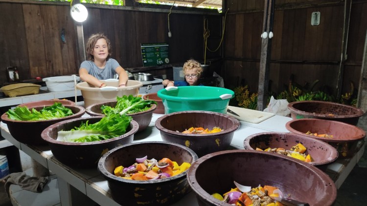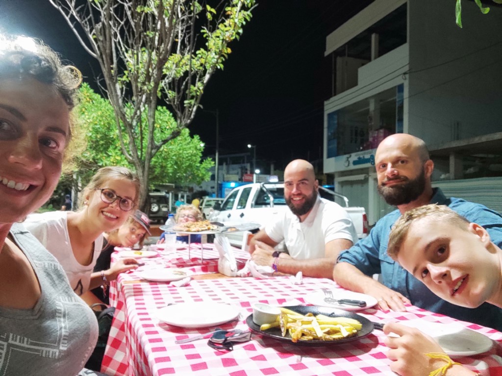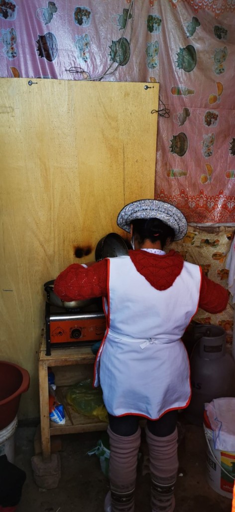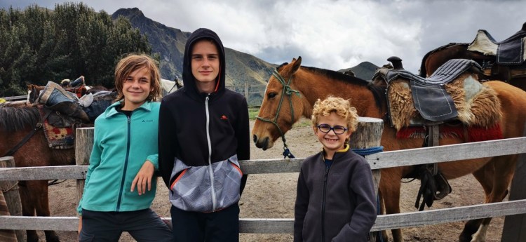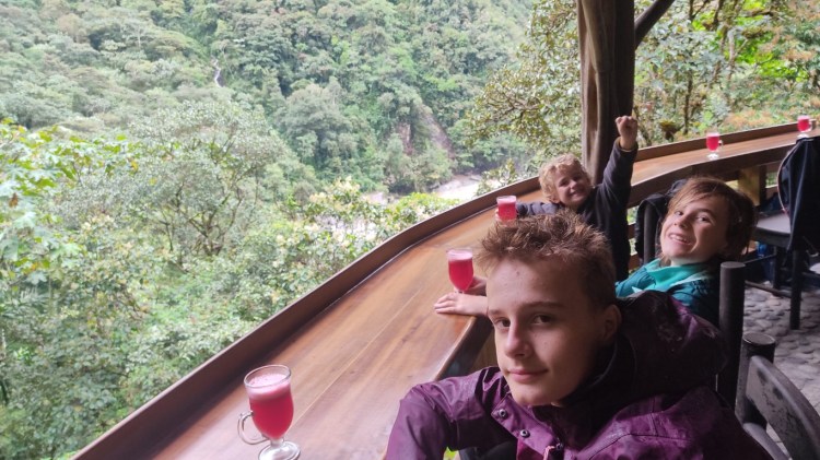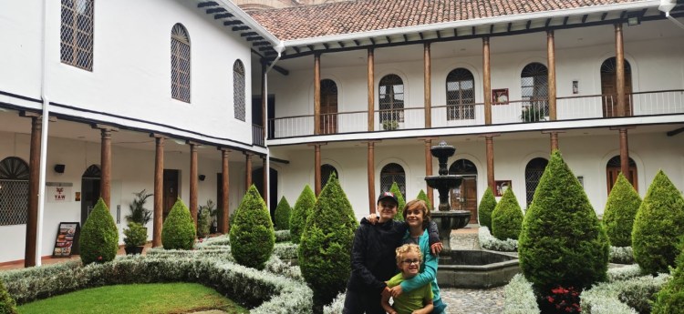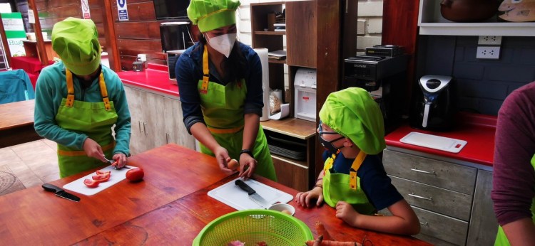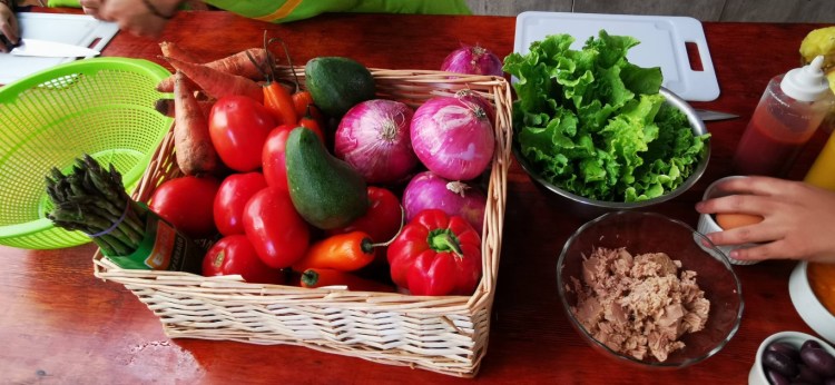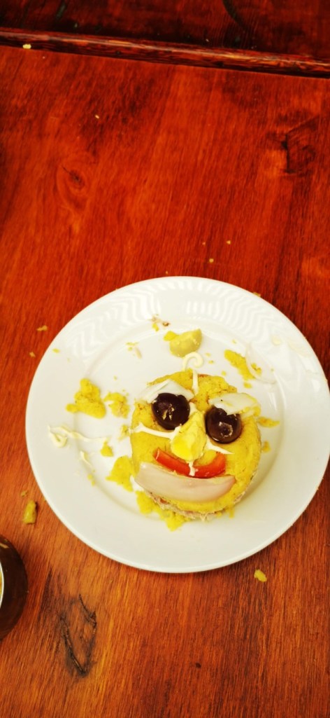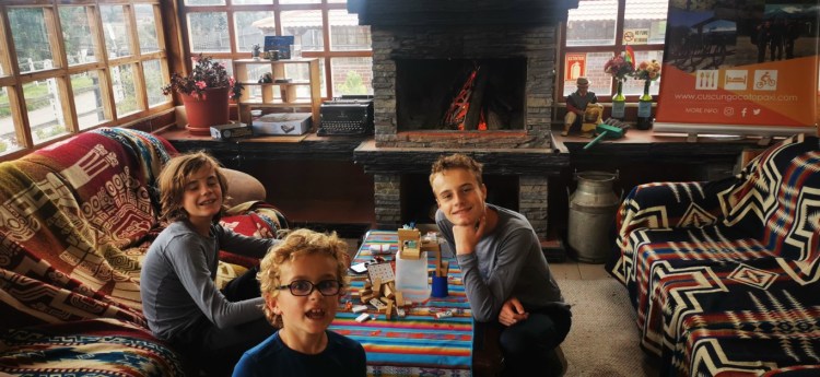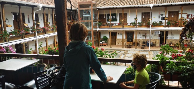 Nous sommes reçus dans une belle auberge au style colonial avec une grande cour intérieur. La chef Alejandra nous reçoit et nous donne notre équipement : tablier et chapeau de cuisinier vert anis, on dirait ratatouille:) et c’est parti pour 2 heures de cuisine. Nous préparons en entrée la Causa Rellena : il s’agit d’une entrée à base de purée de pommes de terre, thon, tomate, oignons, citrons, aji jaune et avocat. Ensuite libre à chacun de bien présenter son assiette, les enfants ont été de vrais artistes ! Pour le plat principal, nous cuisinons un lomo saltado : il s’agit d’un bœuf que l’on fait flamber à l’asiatique avec du aji jaune, de l’oignon, de la sauce soja, de la sauce d’huîtres et du vin rouge. Le tout est servi avec des frites maison et du riz bien sûr. On se régale. Et pour clôturer le tout, en dessert, elle nous sert une crema volteada, à base de quinoa sous la forme d’un riz au lait avec de la cannelle.