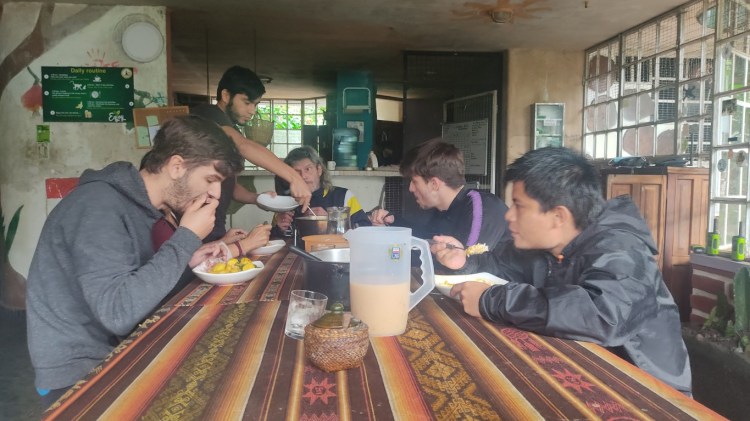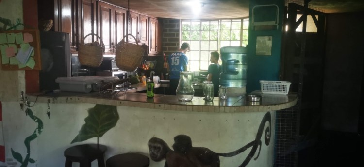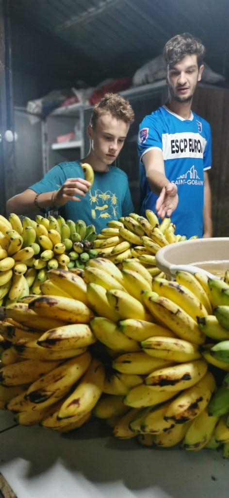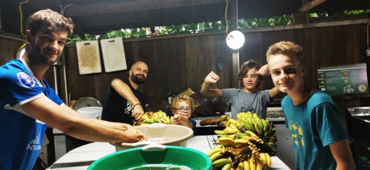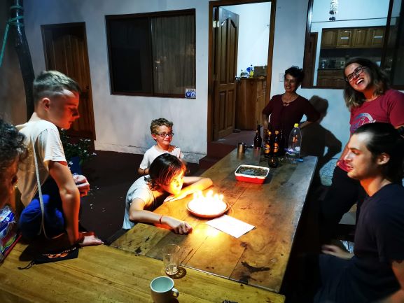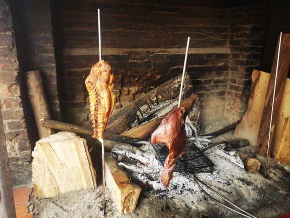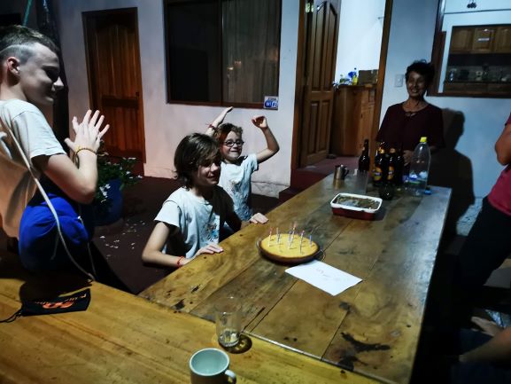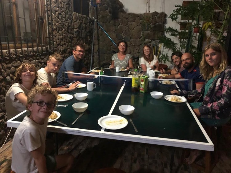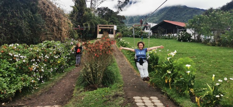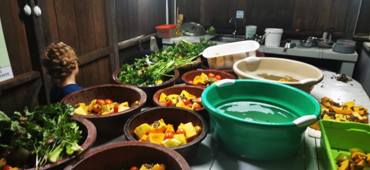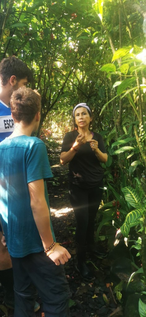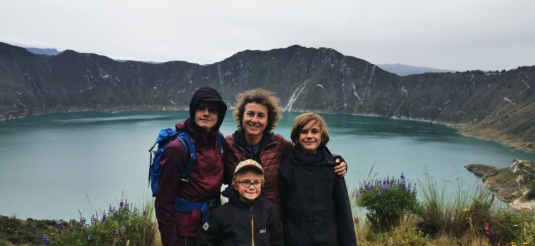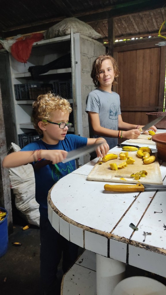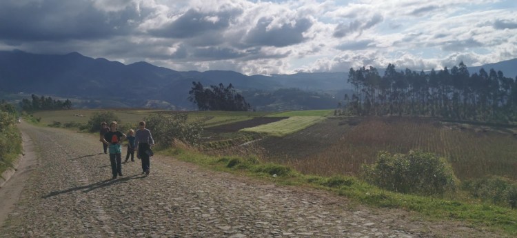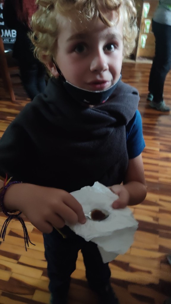 Nous sommes reçus dans une belle auberge au style colonial avec une grande cour intérieur. La chef Alejandra nous reçoit et nous donne notre équipement : tablier et chapeau de cuisinier vert anis, on dirait ratatouille:) et c’est parti pour 2 heures de cuisine. Nous préparons en entrée la Causa Rellena : il s’agit d’une entrée à base de purée de pommes de terre, thon, tomate, oignons, citrons, aji jaune et avocat. Ensuite libre à chacun de bien présenter son assiette, les enfants ont été de vrais artistes ! Pour le plat principal, nous cuisinons un lomo saltado : il s’agit d’un bœuf que l’on fait flamber à l’asiatique avec du aji jaune, de l’oignon, de la sauce soja, de la sauce d’huîtres et du vin rouge. Le tout est servi avec des frites maison et du riz bien sûr. On se régale. Et pour clôturer le tout, en dessert, elle nous sert une crema volteada, à base de quinoa sous la forme d’un riz au lait avec de la cannelle.
