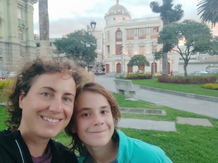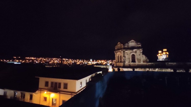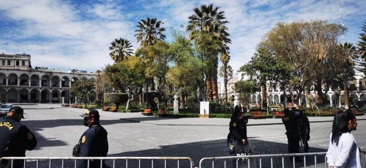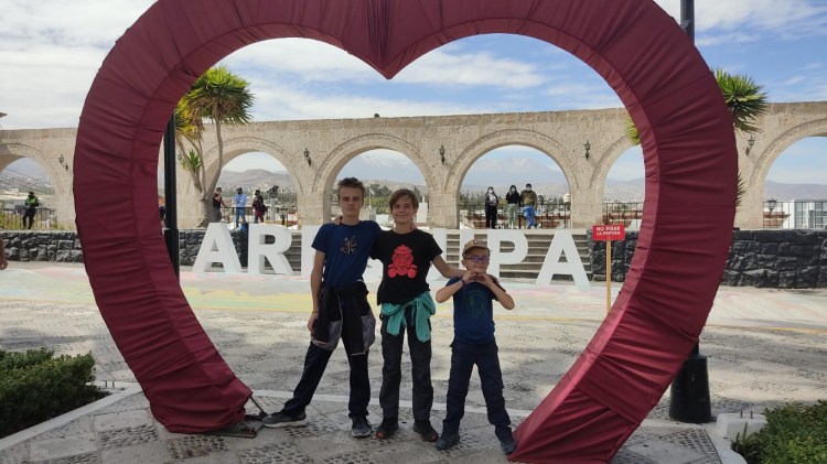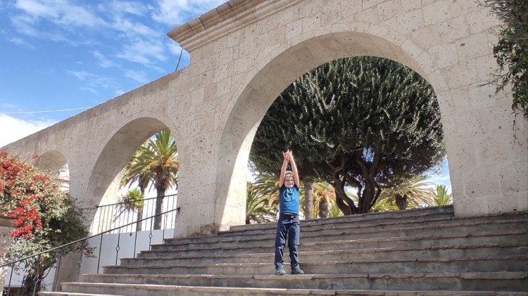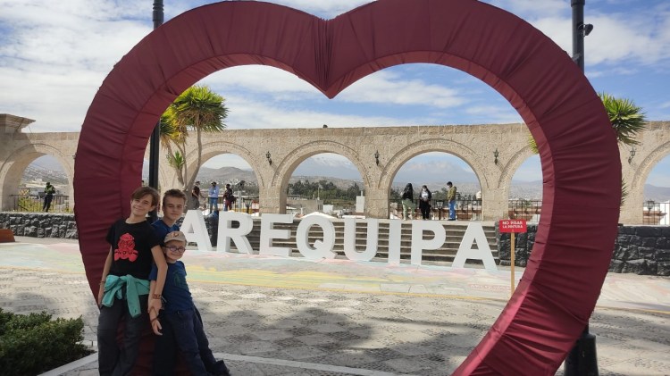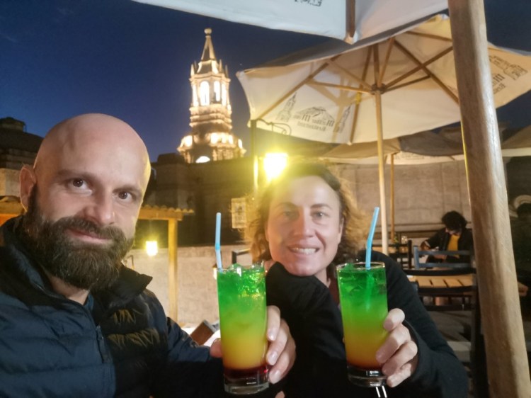 Ensuite nous repartons dans le centre historique d’Arequipa pour flâner dans les rues. Il y a beaucoup de policiers, le gouvernement craint des manifestations. En fait, nous sommes arrivés en pleine élection présidentielle. Le président aurait dû être officiellement nommé le 8 juin mais il s’avère que la candidate perdante crie au trucage des votes donc le résultat est mis encore en suspens pour vérification bulletin par bulletin. Comme ce sont deux parties extrêmes (extrême gauche avec l’ancien instituteur et extrême droite avec la candidate asiatique qui risque 30 ans de prison si elle n’est pas élue et fille d’un dirigeant lui même en prison pour crime contre l’humanité… ça en dit long !) qui se disputent le pouvoir, il y a des risques d’échauffement de la population. Du coup, même la grande place est barricadée et on ne peut visiter la cathédrale de la place l’après-midi. Nous finissons cette journée de promenade par un petit apéro en amoureux sur un rooftop de centre historique, pendant que les enfants se reposent à l’auberge.