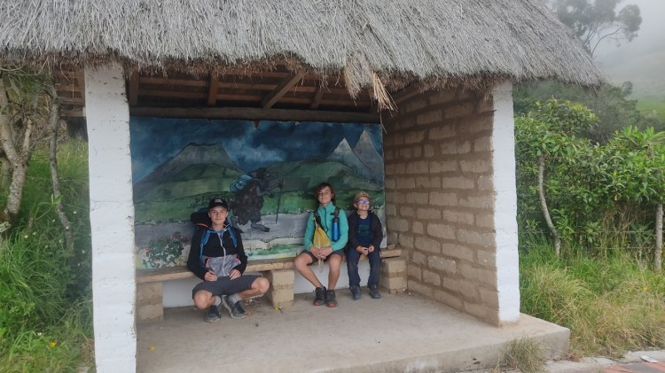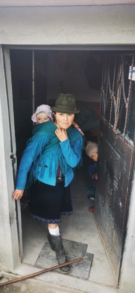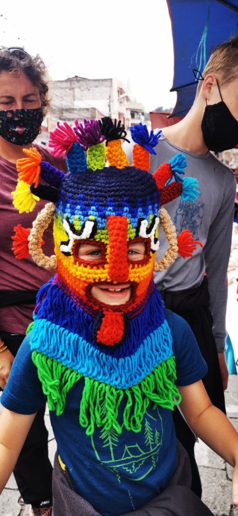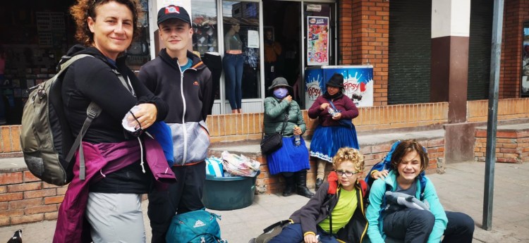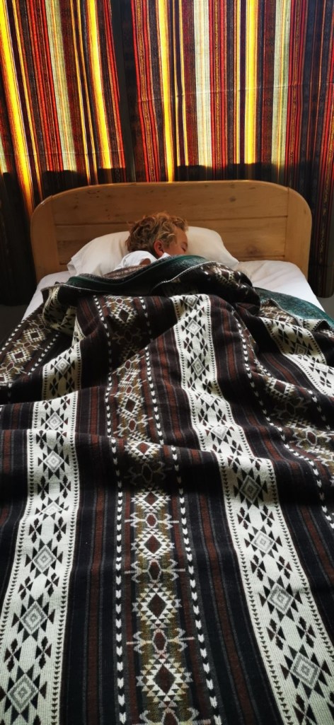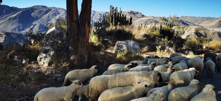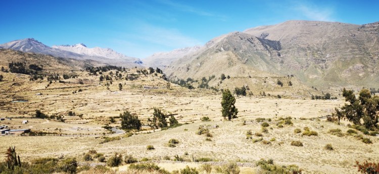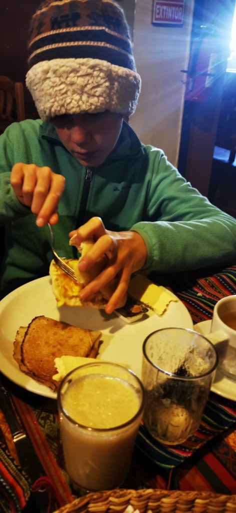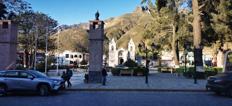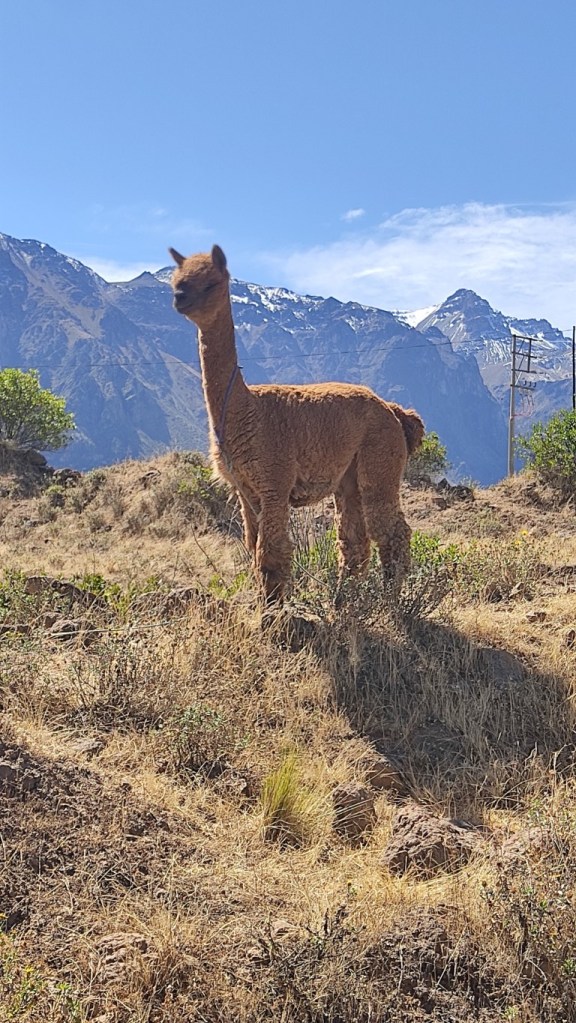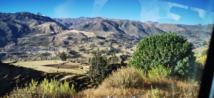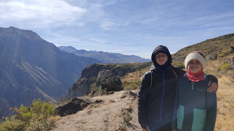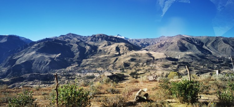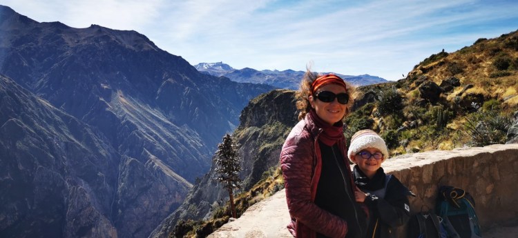 Nous récupérons nos sacs à l’auberge et nous filons au terminal de bus pour prendre un collectivo en direction de Chivay, point d’entrée du Canyon de Colca. Sur le coup, nous ne sommes pas bien rassurés car le chauffeur charge une énorme bouteille de gaz dans le coffre un peu difficilement, on ne voudrait pas que ça pète sur la route ! On se renseigne, il s’agit d’oxygène. Bon on se décide à le prendre quand même. C’est parti pour 4 heures de route. On met beaucoup de temps à quitter la ville comme toujours entre les bouchons et les arrêts intempestifs. Mais une fois sur la grande route, nous sommes subjugués par les paysages de montagnes désertiques. Cela nous change beaucoup de ce que nous avions vu jusqu’à maintenant en Equateur et Colombie. La fin du trajet sera un peu plus désagréable car il fait nuit et ça tournicote dans tous les sens, Hugo est d’ailleurs bien brassé. Nous arrivons donc à la nuit dans la ville de Chivay. Le terminal est un peu en dehors, nous passons par pleins de petites ruelles pour rejoindre la place centrale et notre hotel. Au hasard d’une de ces ruelles, nous sommes surpris par un petit chien argneux et un gros berger allemand. J’essaie de traverser vite en protégeant Malo qui a très peur. Il en perd sa casquette par terre, et le petit chien se fait un plaisir de la récupérer et de filer avec. Avec le berger allemand qui grogne fort, je console Malo pour sa casquette et lui dis qu’il vaut mieux filer, on en trouvera bien une autre au Pérou… Nous arrivons enfin à notre hotel, les chambres sont très bien mais par contre il y fait un froid de canard. Pour preuve, il y a 4 grosses couvertures de alpaga sur le lit ! On part vite dîner avant le couvre-feu dans une pizzeria où il fait tout aussi froid. On mange en doudoune et bonnet !