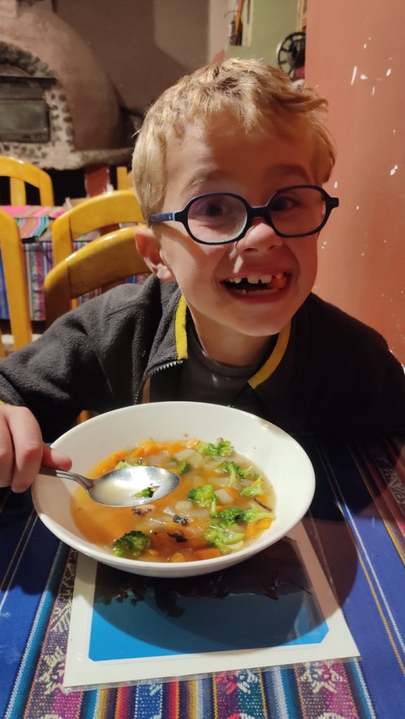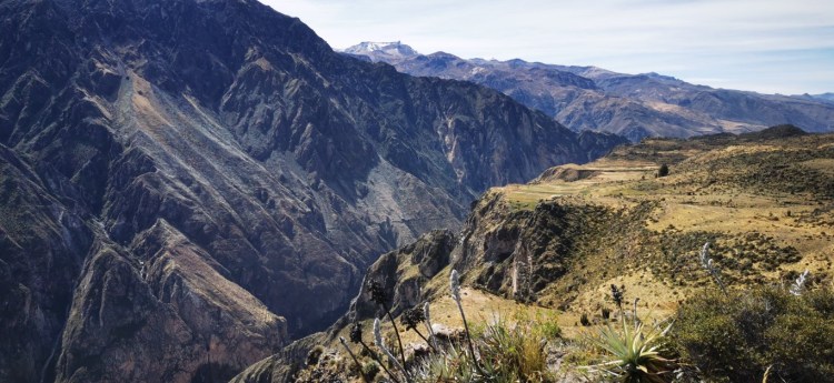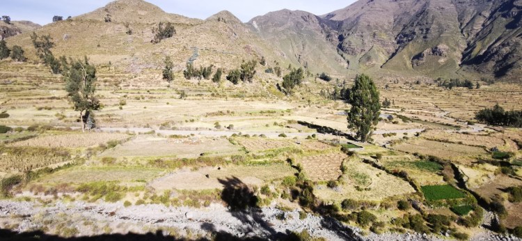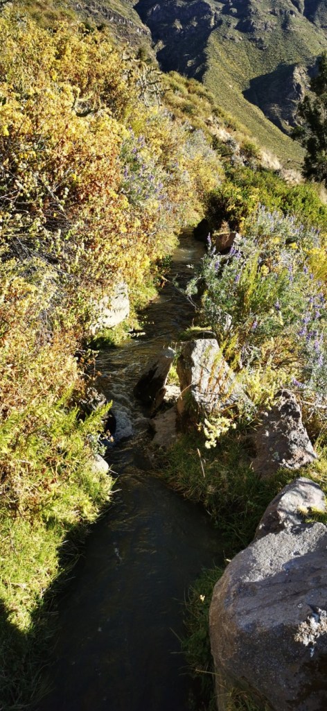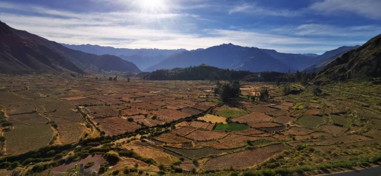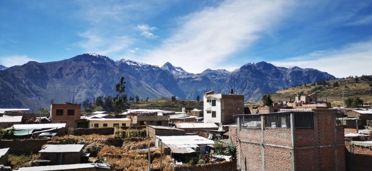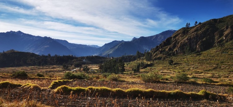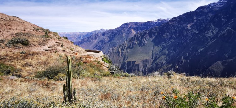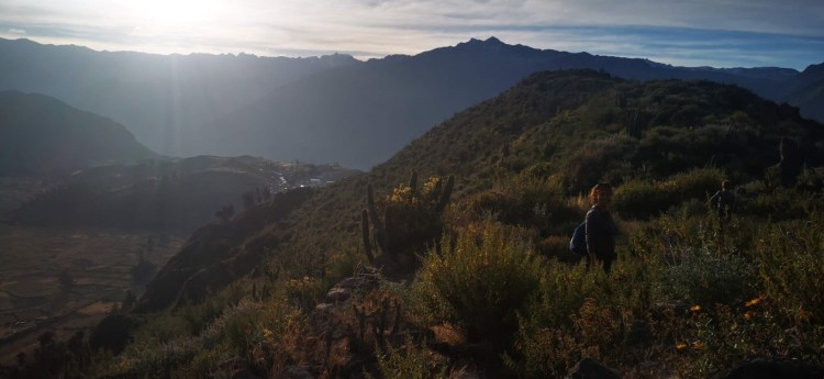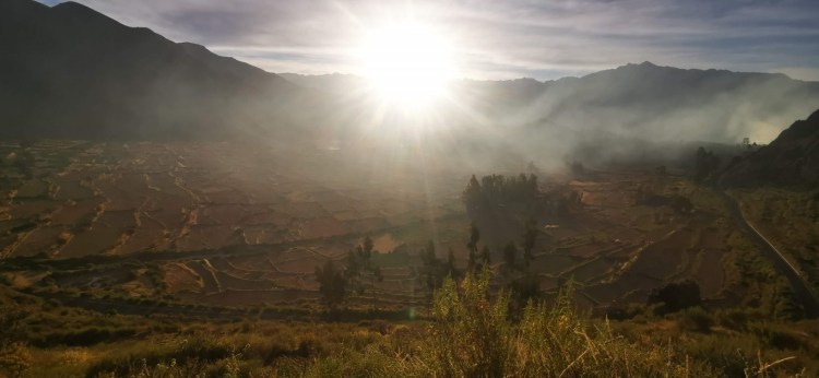 Nous nous installons à notre auberge, la Pachamama où on prend notre déjeuner. Puis nous repartons l’après-midi pour une petite ballade sur les hauteurs du village pour aller voir des ruines pré-incas. Au final, on marche quand-même 3 heures, 8km et une bonne grimpette de 350m de dénivelé positif pour rejoindre ce site. Mais le panorama est juste encore incroyable : d’un côté l’autre vallée et une autre chaine de montagnes avec la fumée d’un volcan au loin, de l’autre côté les flans de montagnes en terrasses qui descendent jusqu’au début du canyon, et la vue au loin sur ce profond précipice creusé par la rivière Colca. Nous terminons cette randonnée à la lueur du soleil couchant. Dès que la nuit est là, il recommence à faire très très froid. Nous rentrons vite à l’auberge et préparons notre dîner : une bonne soupe bien chaude.