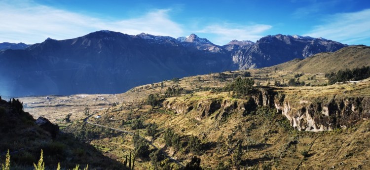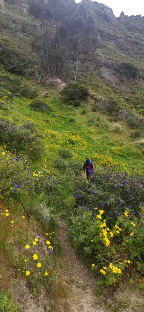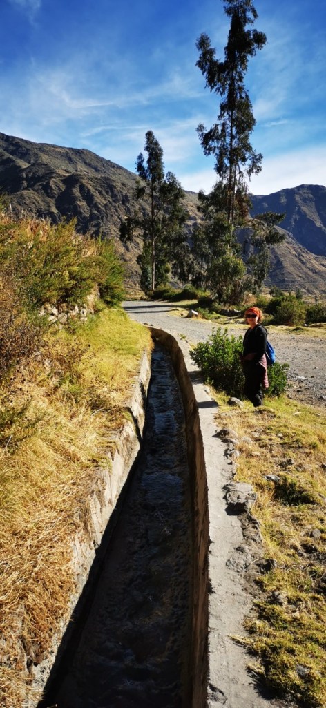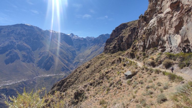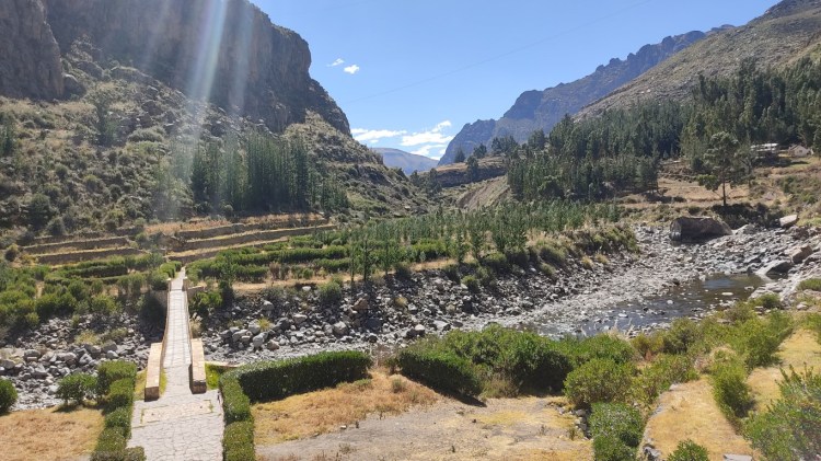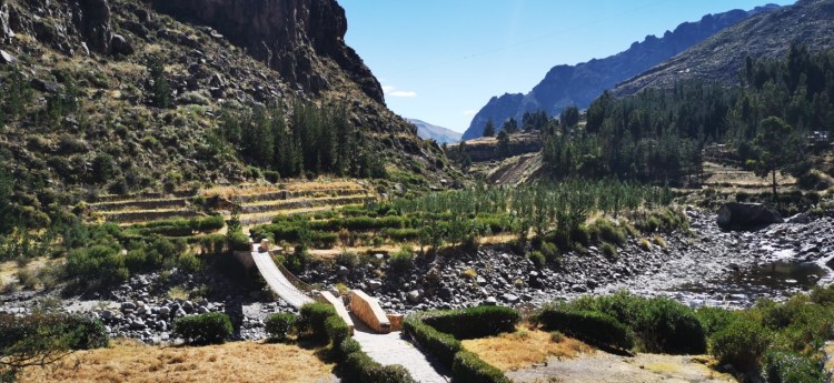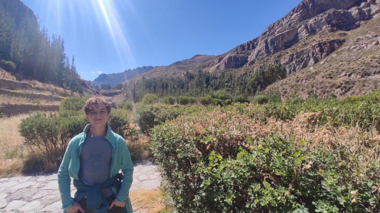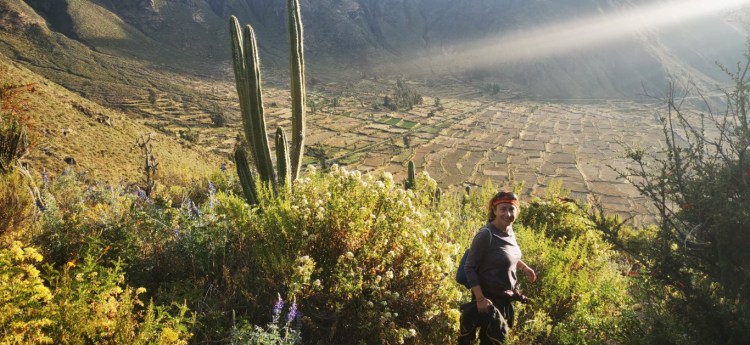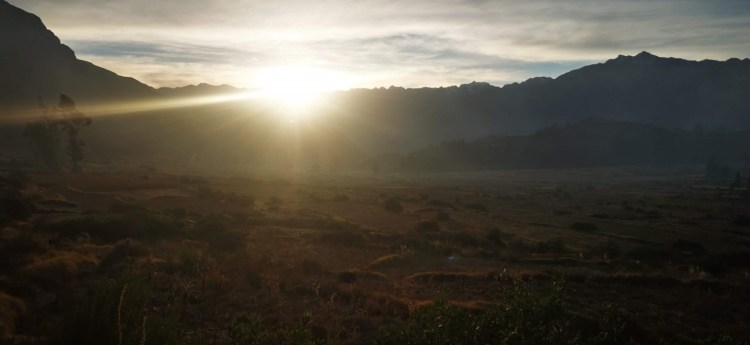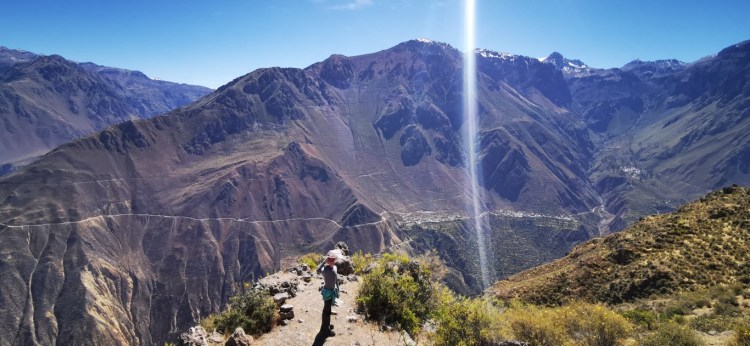 Nous nous installons à notre auberge, la Pachamama où on prend notre déjeuner. Puis nous repartons l’après-midi pour une petite ballade sur les hauteurs du village pour aller voir des ruines pré-incas. Au final, on marche quand-même 3 heures, 8km et une bonne grimpette de 350m de dénivelé positif pour rejoindre ce site. Mais le panorama est juste encore incroyable : d’un côté l’autre vallée et une autre chaine de montagnes avec la fumée d’un volcan au loin, de l’autre côté les flans de montagnes en terrasses qui descendent jusqu’au début du canyon, et la vue au loin sur ce profond précipice creusé par la rivière Colca. Nous terminons cette randonnée à la lueur du soleil couchant. Dès que la nuit est là, il recommence à faire très très froid. Nous rentrons vite à l’auberge et préparons notre dîner : une bonne soupe bien chaude.