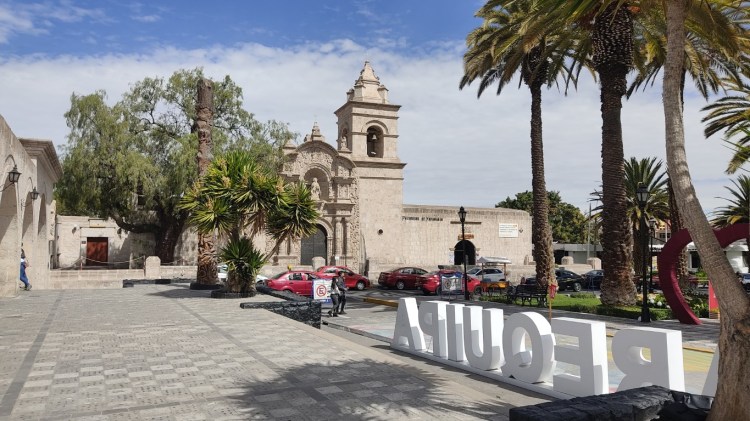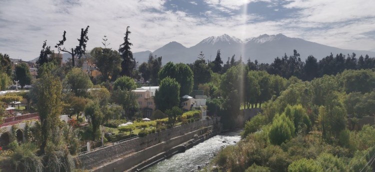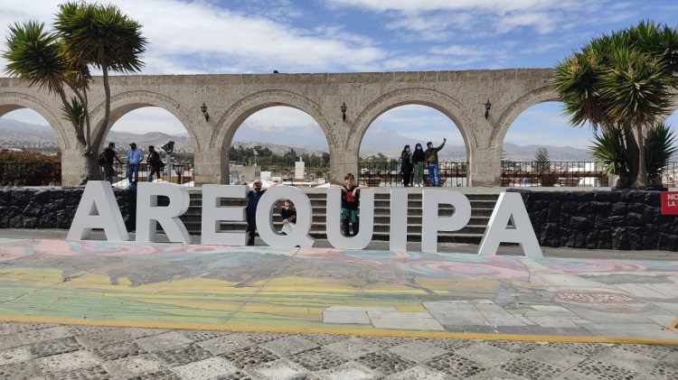 Nous arrivons au point de vue où l’on retrouve le nom de la ville écrit en grosses lettres comme dans tous les coins d’Amérique latine. Arequipa est entourée de montagnes et de volcans. Le mirador offre un panorama splendide sur la ville et les 3 volcans Misti (5825m), Chachani encore un peu enneigé (6075m) et le Pichu Pichu (5571m). La ville, elle-même, est à 2235m d’altitude. Nous sommes bien dans les Andes et on ne va pas les quitter du Pérou.