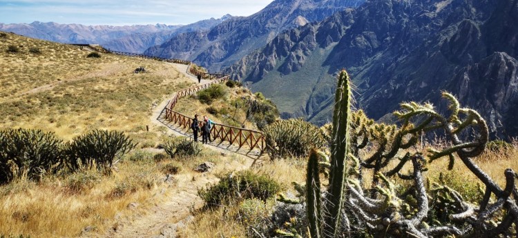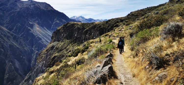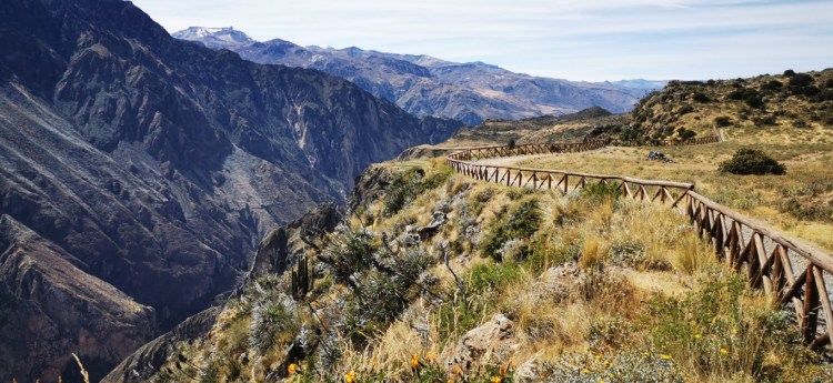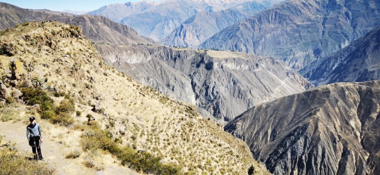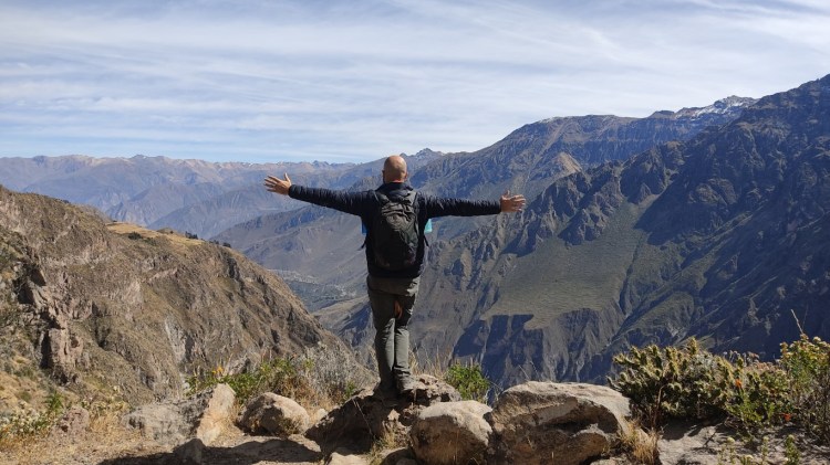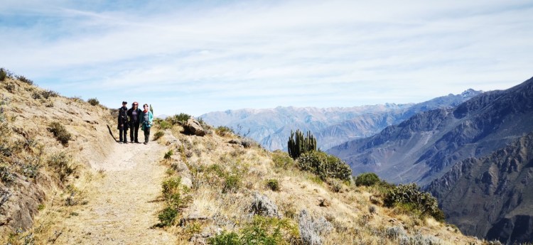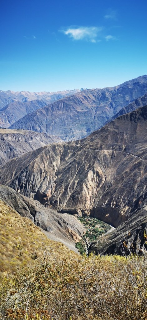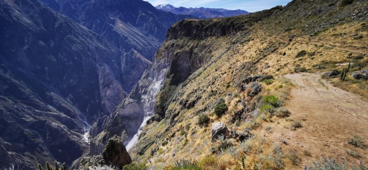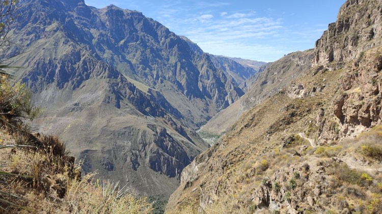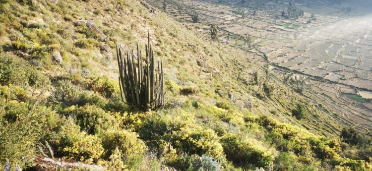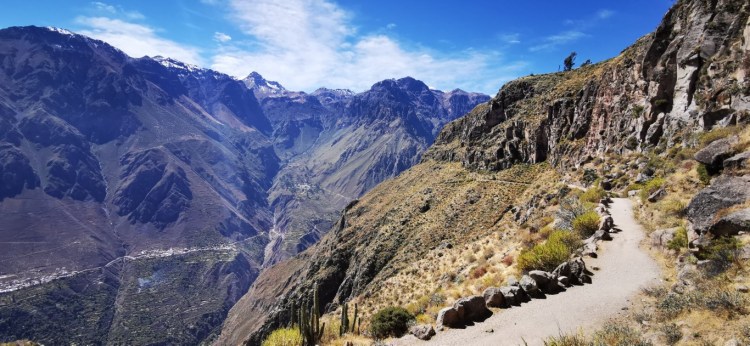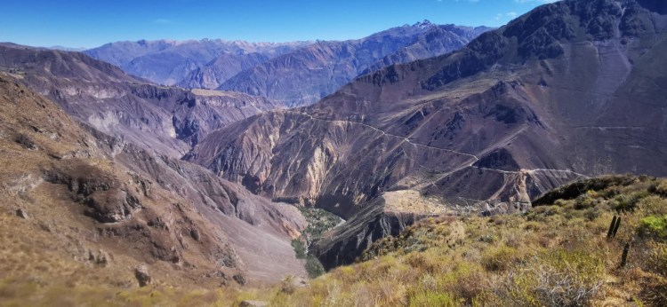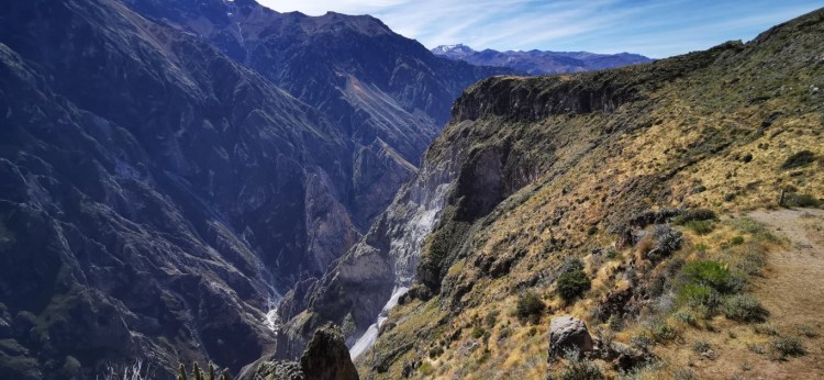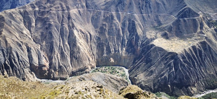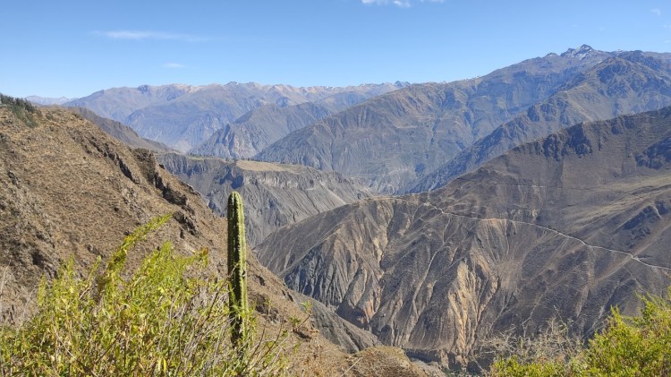 Le lendemain matin, nous nous levons tôt pour attraper le collectivo de 8h en direction de Canabaconde où se trouve le mirador del condor. Contrairement aux 2 heures de route annoncées, nous arrivons au bout de seulement 45 minutes à destination. La route pour s’y rendre est très belle car elle longe le canyon de Colca qui se creuse de plus en plus au fur et à mesure que l’on s’éloigne de Chivay. Nous arrivons donc un peu avant 9h au mirador del condor, c’est parfait car on nous a indiqué que les condors pouvaient être visibles entre 9h et 11h le matin seulement. Ce mirador domine le canyon, qui s’enfonce de plus de 3000m de profondeur. Autant vous dire que le paysage est vraiment à couper le souffle. Nous quittons vite le mirador principal où tous les touristes s’agglutinent (certes il n’y en a qu’une vingtaine c’est rien par rapport au temps normal…) pour rejoindre un autre mirador en contre-bas où nous sommes tous seuls. Et là, que le spectacle commence ! Nous voyons un, deux, trois… en fait une dizaine de condors qui pendant deux heures vont voler au dessus de nos têtes, s’enfoncer dans le canyon, remonter… Un vrai balai de ces oiseaux majestueux pouvant atteindre 3,5m d’envergure les ailes déployées. Lors qu’ils passent au dessus de nos têtes, nous entendons même le bruit de l’air glissant sur leurs ailes. Nous sommes subjugués et passons près de deux heures à les observer. Nous sommes tellement gâtés que nous décidons de nommer le 10 juin la journée officielle du condor ! Puis nous continuons la boucle des miradors, 5 kms au total, pour profiter pleinement du paysage de ce canyon. De retour au mirador principal, il n’y a plus personne, même pas les femmes Queschuas qui vendaient des souvenirs. Nous patientons une dizaine de minutes avant d’alpaguer un collectivo pour rejoindre le village de Canabaconde.