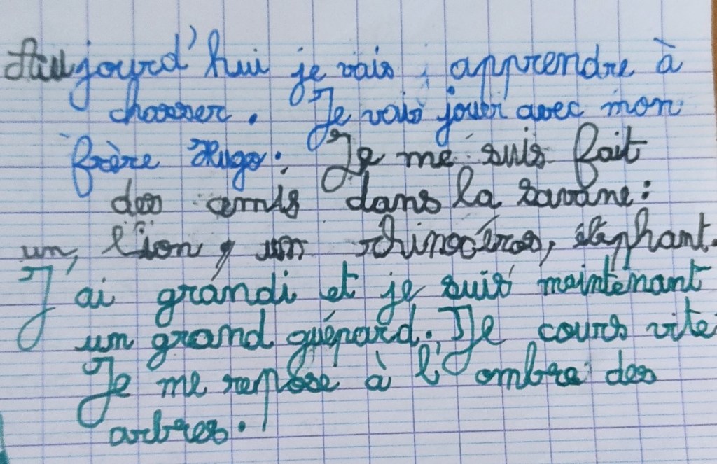 Le voyage continue et les enfants sont toujours aussi inspirés pour inventer des histoires. En Namibie, j’en profite pour leur donner un sujet : « imaginez vous en animal de la savane et racontez votre vie ».