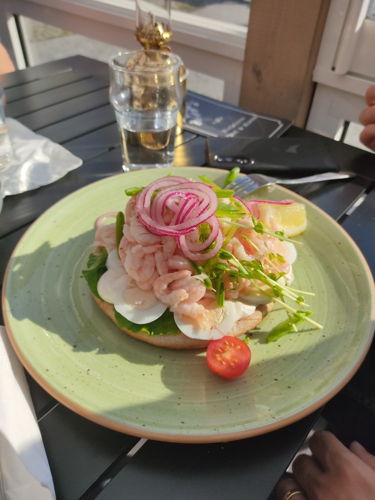 Pour 4 personnes : 2 c. à soupe de fromage à la crème ramolli, 2 c. à soupe de yogourt grec nature, 400 g de crevettes nordiques, 1 pincée de sucre, 1 petite branche de céleri hachée finement, 1 oignon vert haché, 1 trait de sauce piquante de type « Sriracha », le zeste d’un citron, 3 c. à soupe d’aneth haché, sel et poivre, 1 petit concombre émincé finement, 2 radis émincés finement, des pousses de radis ou de pois, 4 tranches de pain suédois dit pain polaire