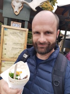 Préparer une purée de pommes de terre maison. Fouetter la crème fraiche. Faire griller la viande fumée d’élan. Placer la tortilla pour que cela fasse un cône à remplir. Mettre au fond du cône la purée de pommes de terre maison, puis la viande d’élan poêlée, ajouter la crème fraiche fouettée, un peu de confiture de cloudberry et terminer par une pincée d’herbes fraiches. Il ne reste plus qu’à déguster !! un délice !!