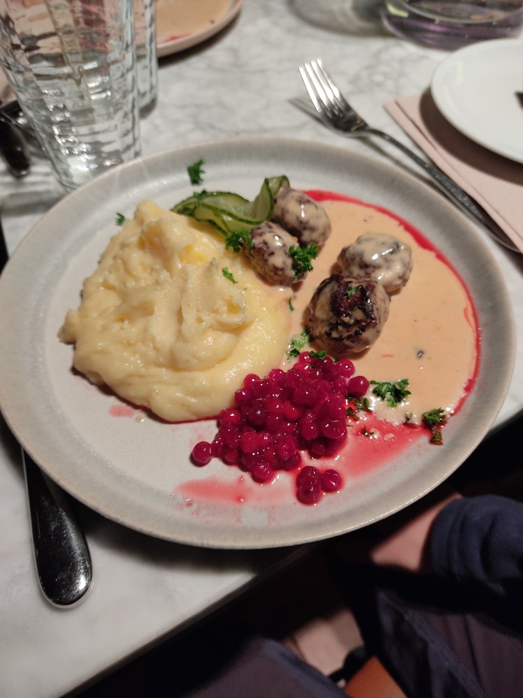 Pour les boulettes : faire revenir l’oignon pendant 5 min, ajouter l’ail et l’origan. Mélanger le bœuf haché, le mélange oignon/ail/origan, la pomme de terre râpée, ajouter sel, poivre, persil haché et œuf. Façonner les boulettes et les faire revenir dans un peu d’huile et beurre. Pour la sauce : ajouter 4 c. à s. de beurre dans la poele où ont cuit les boulettes. Une fois le beurre fondu, ajouter la farine et remuer jusqu’à coloration dorée. Incorporez le bouillon de boeuf et cuire sur feu moyen. Ajouter la crème, la moutarde et laisser mijoter jusqu’à épaississement. Remettre les boulettes de viande en sauce, couvrez et laissez mijoter à feu doux pendant environ 10 minutes. Servir avec une purée maison et quelques airelles.